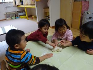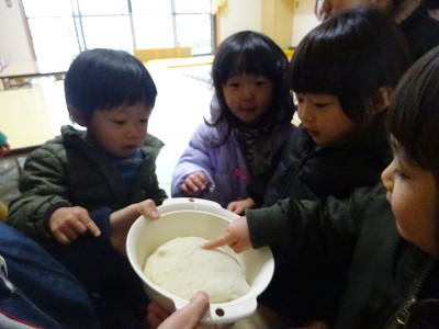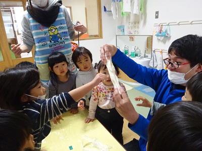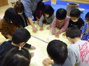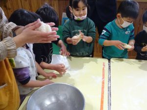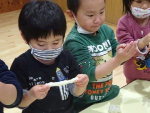 手にくっつく💦と言って困っている子がいると、「粉をつければいいんだよ!」と教えてくれる友だちがいました。その後、みんなでしっかり手に粉をつけ、白くなった手を見せ合って楽しんでいた子どもたちです。その手でおもちにさわると、「ほんとだ!くっつかない」と粉の魔法に気づいて感動?の様子でした。(粉は片栗粉です)