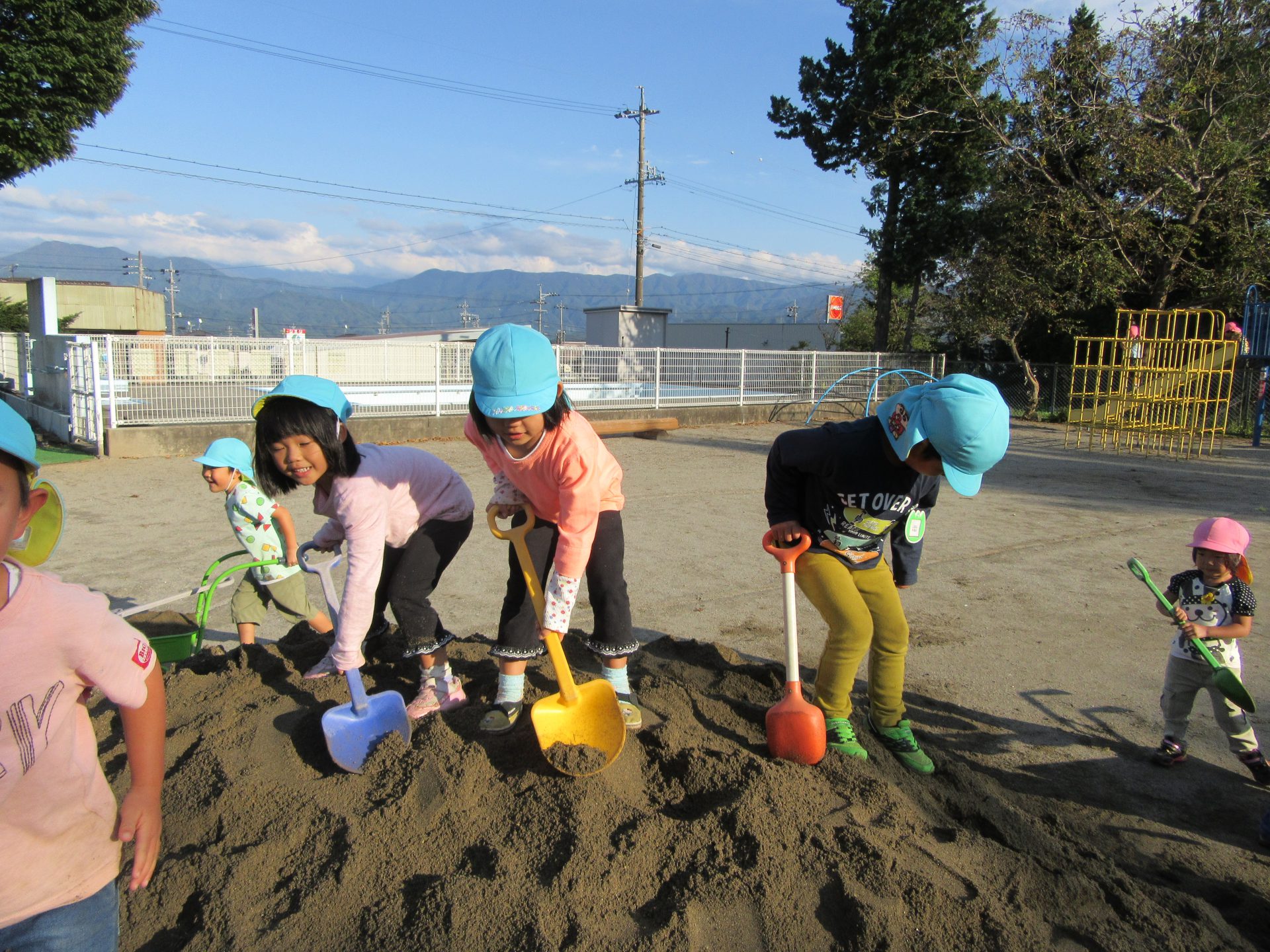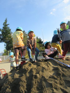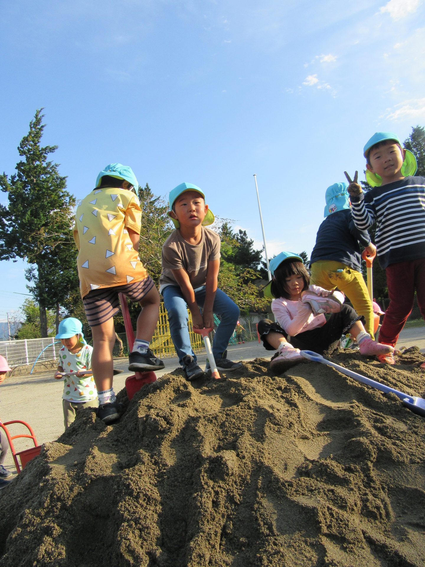 ・園庭に砂場用の山ができると興味津々で近づき登ったり触ったりして楽しんでいた。