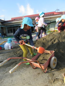 ・そのうちに「なんで砂場にはいれないの?」「僕たちで運ぼう!」と運び始めたが
