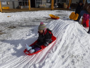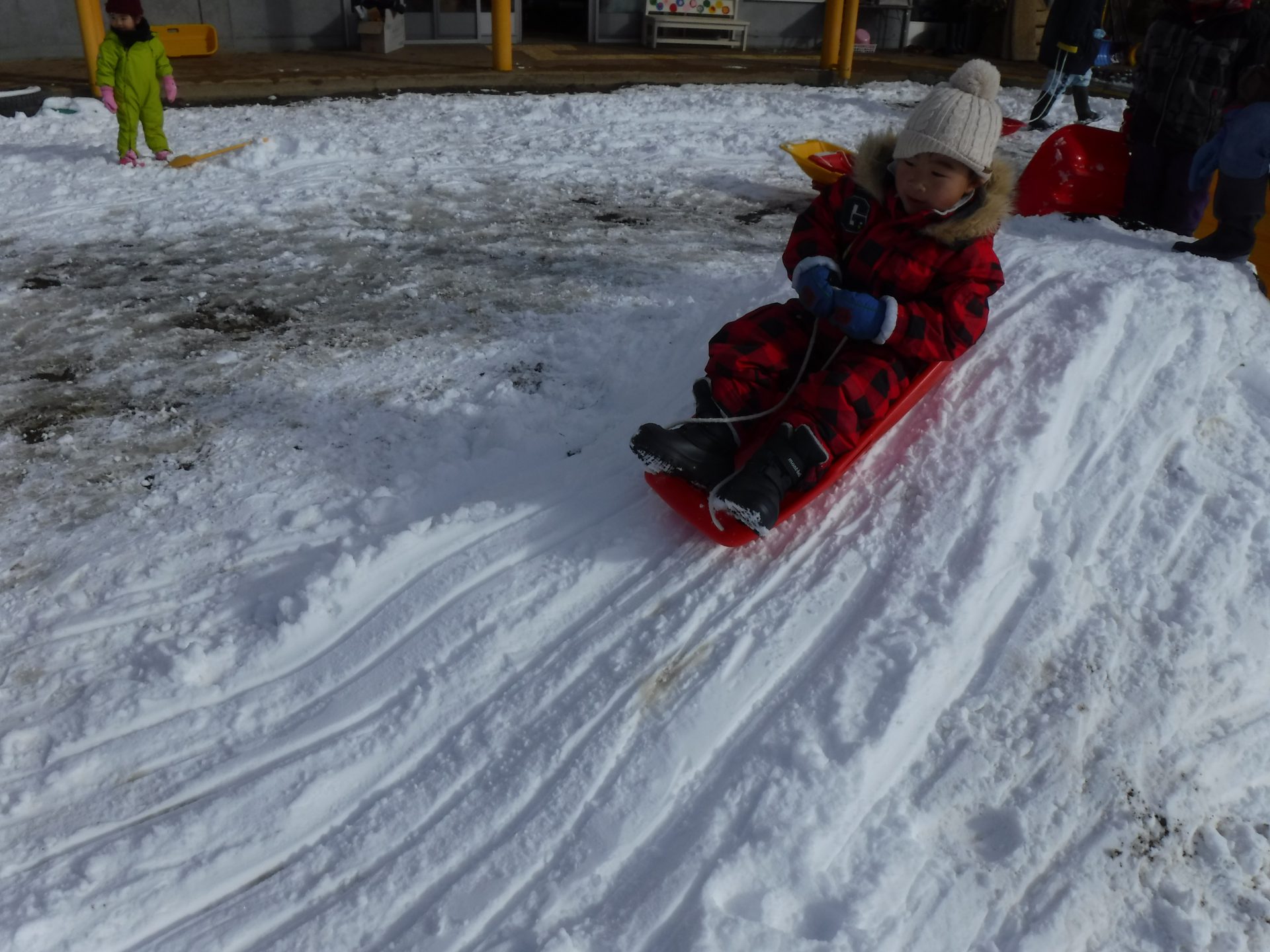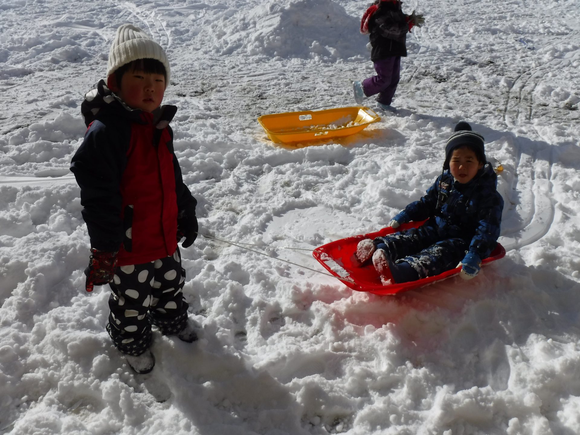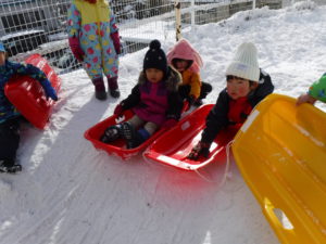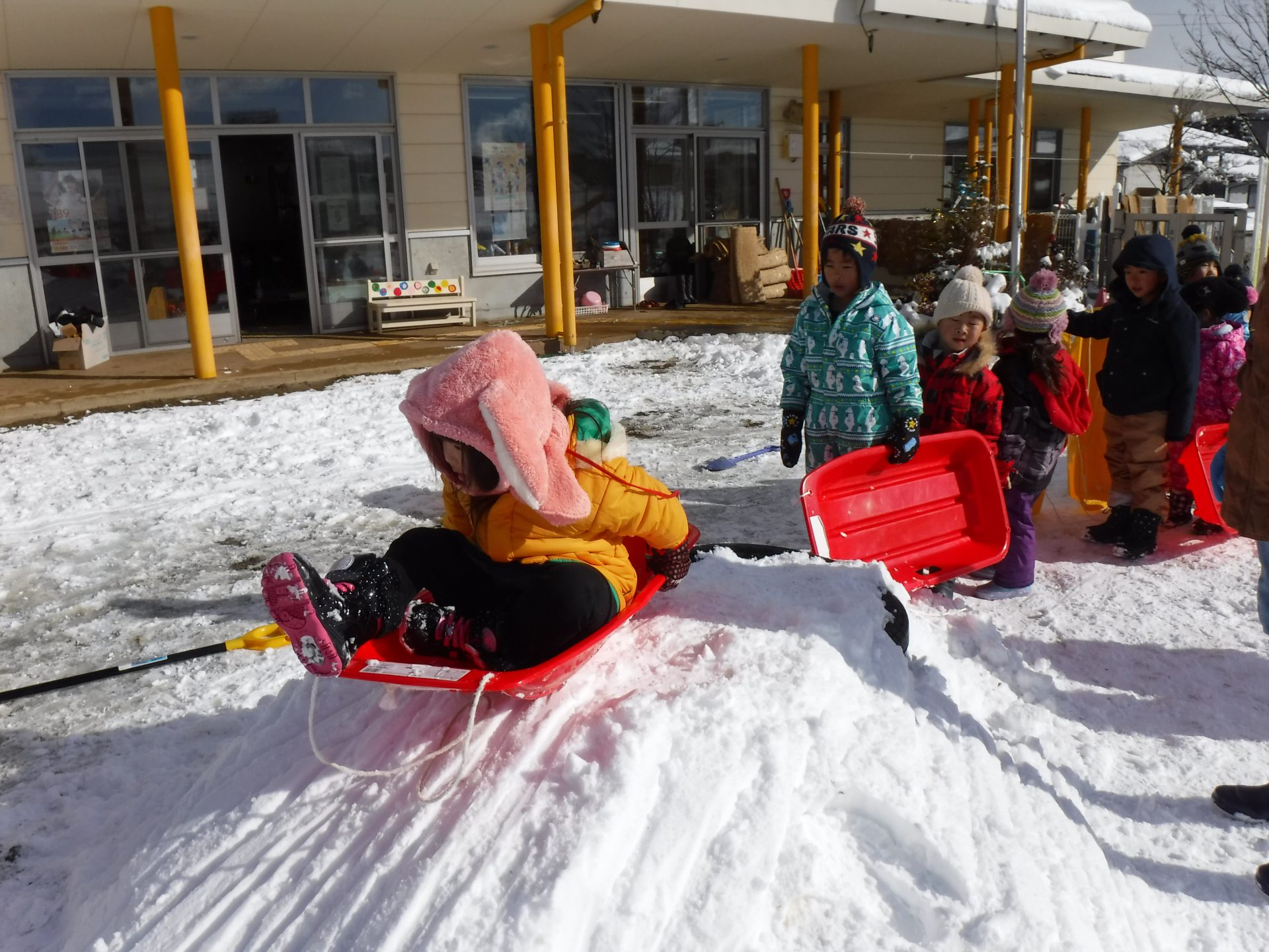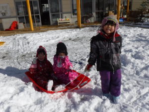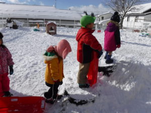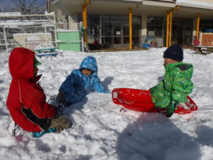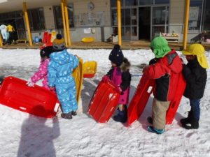 園庭がゲレンデになり、あちらこちらでそりを走らせます。