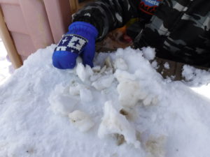 雪下ろしをしたハウスの中で、慣れた手つきで”そば饅頭‘’を作っている2歳児さん。
