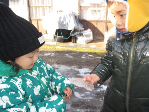 割れた氷を手でつかみ、「こんなに大きいの取れたよ」と話すお友だちも。