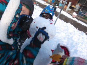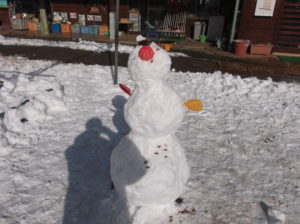 大人にとっては厄介ですが、子どもたちはおおはしゃぎです。「雪だるまをつくろう。」「オラフがいいよ」「かおもつくろう」「「鼻はにんじんがいいよ」「給食の先生にたのんでみよう」と言いながらあっという間に3段の雪だるまができました。