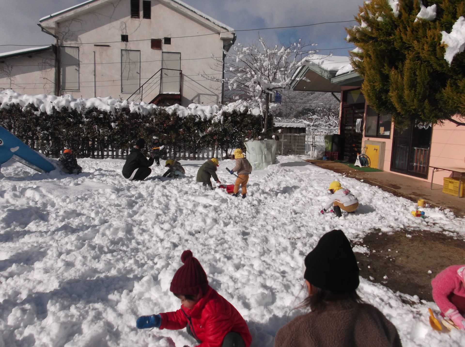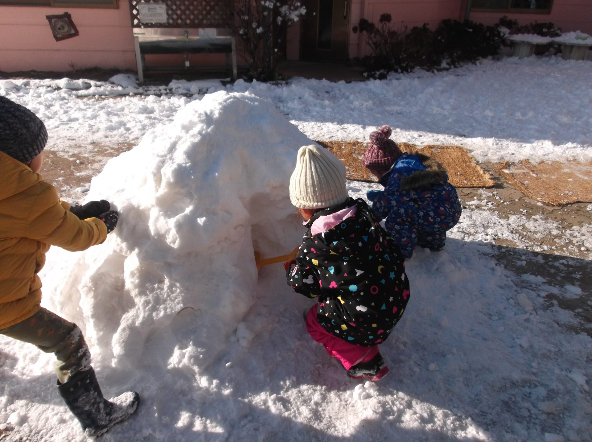 かまくらを作ろうと手で掘っている子、しゃべるで掘っている子いろいろですが、一生懸命に掘っている姿がいいですね。雪だるまも一生懸命に雪玉を丸めていました。友達をそりに乗せている姿も力いっぱい引っぱっています。