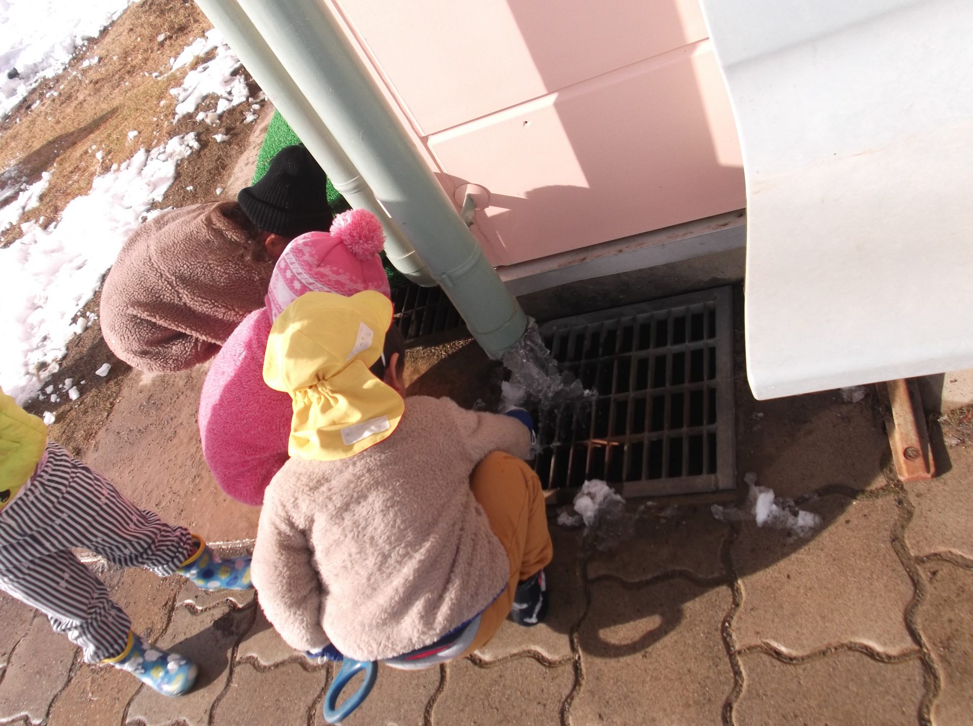 2歳児さんは雪もいいけれど、樋から垂れる水とつららに夢中です。しゃべるで水をすくったり、つららを割ったり楽しそうでした。