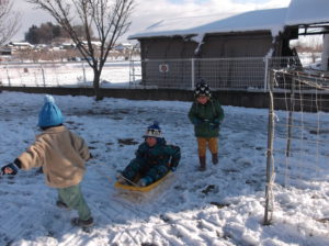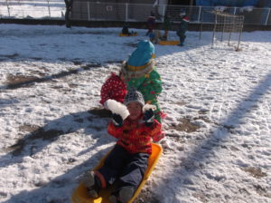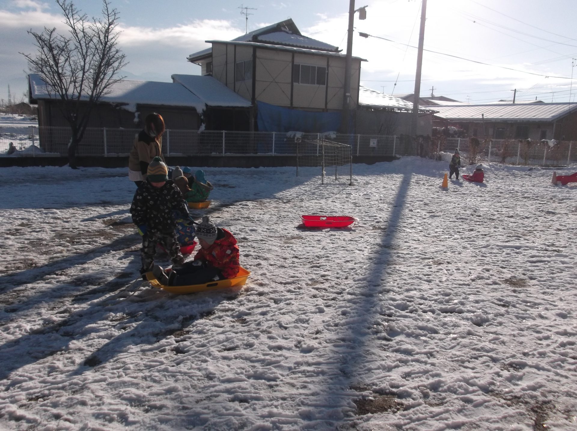 「日陰の方がゆきいっぱいあるね。」「ガタガタしていてうまくすべらない」と言いつつ友達をそりに乗せてあげていました。
