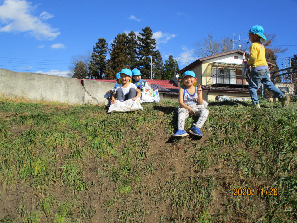 11月の終わりには、まだこんな風景でした。動くと暑くなり衣服を調整しながら、土手でお尻滑りを楽しんでいます。