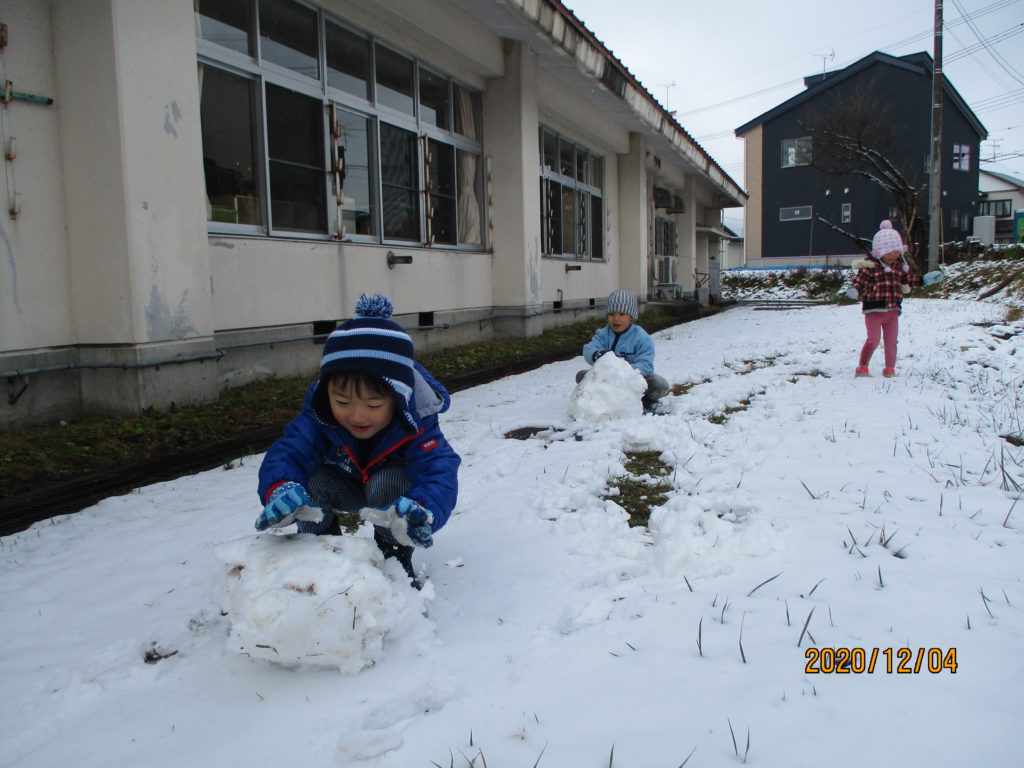 またたくさん積もった日にも雪だるまを作ろうとした子ども達ですが、なかなか雪がうまく丸く固まりません。「なんか今日の雪サラサラしてるね」