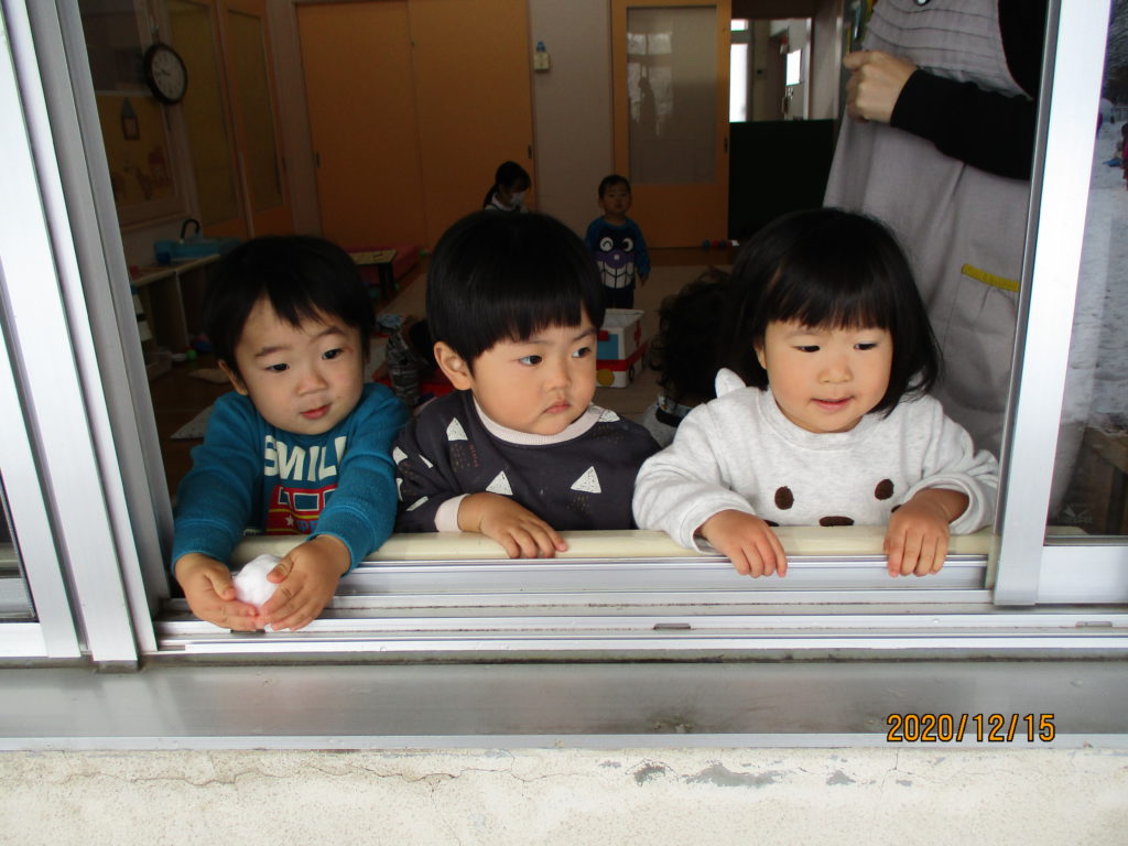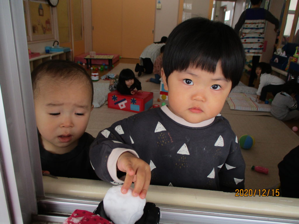 幼児さんが遊ぶのを窓から眺めていた0、1歳児さん。「小さい子たちも雪触りたいかなぁ??」窓越しに雪玉を見せてあげると、興味津々に手を伸ばしてこの表情!