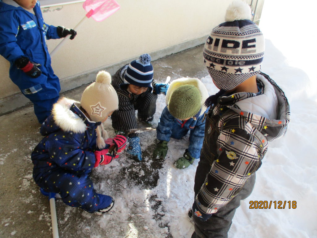 「園庭見てごらん。」と声をかけると、「お庭はぐちゃぐちゃで遊べないけどわくわく広場なら雪まだあるよ!」としっかり園舎裏の広場を観察済みで発言していた子ども達。