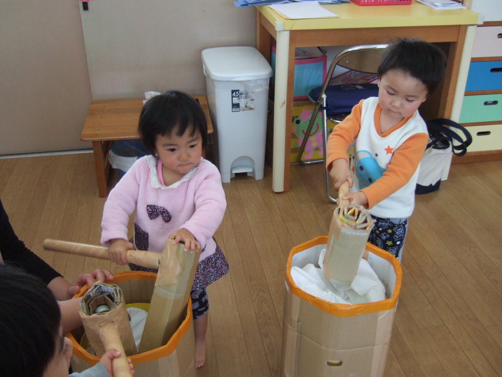 もちつきコーナーでは、先日行ったおもちつきの様子をよく覚えていてうすを両手でもってぺったんぺったん!