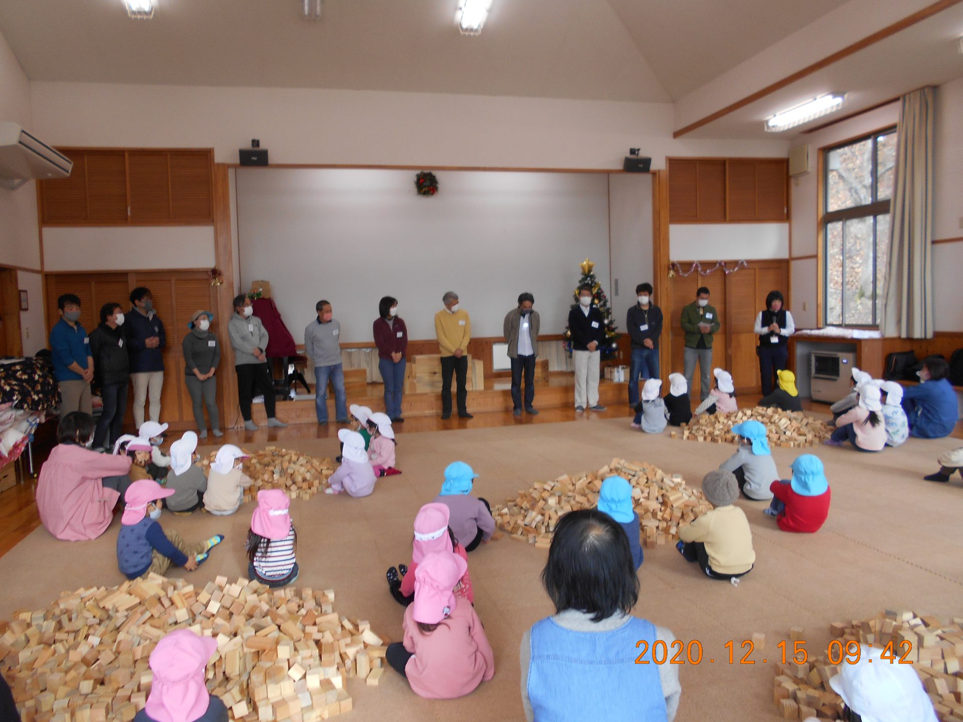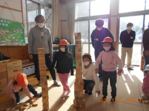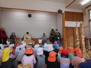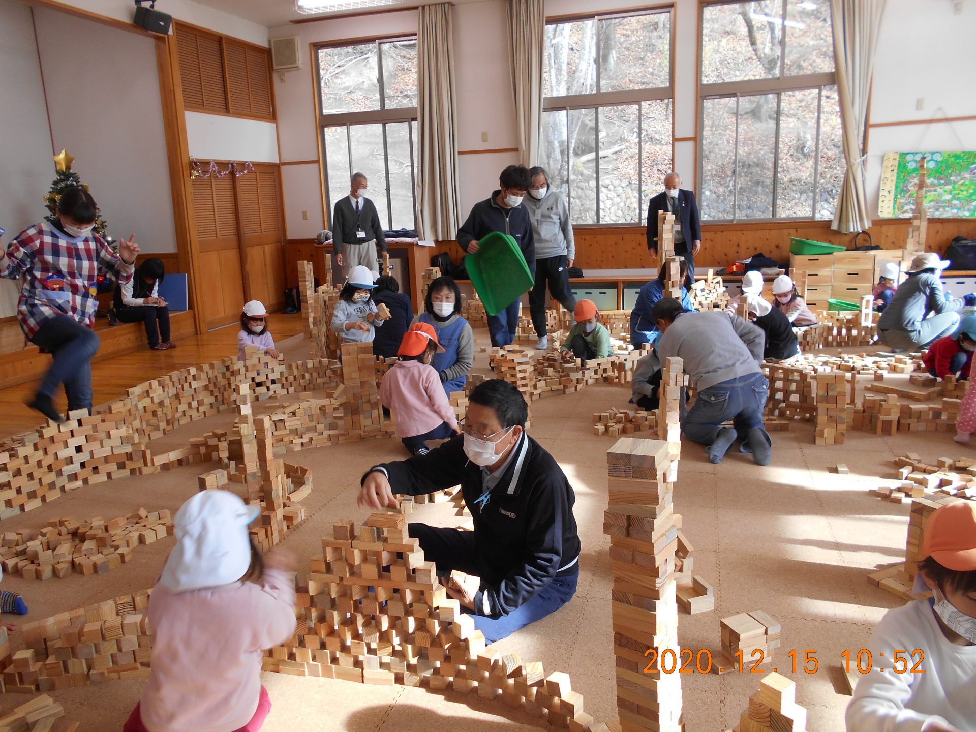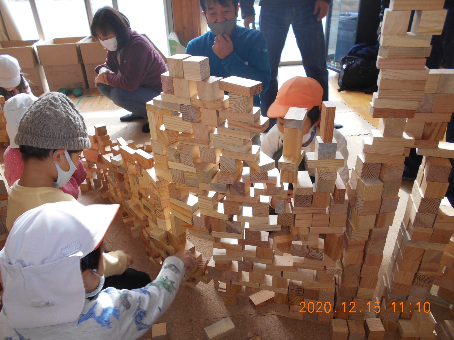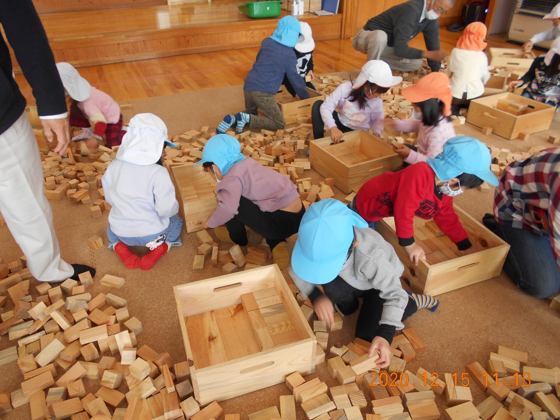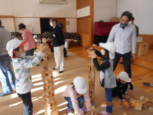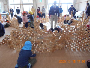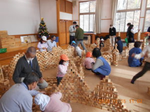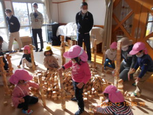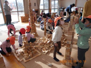 「里山再生プロジェクト」からなる積木キャラバンのみなさんが来られ、松枯れ材から作った積木を使い一緒に遊びます。とてもたくさんの積木に子ども達は大喜びです。