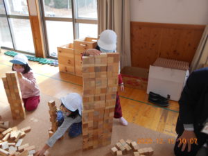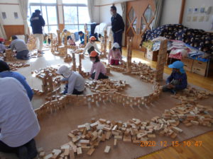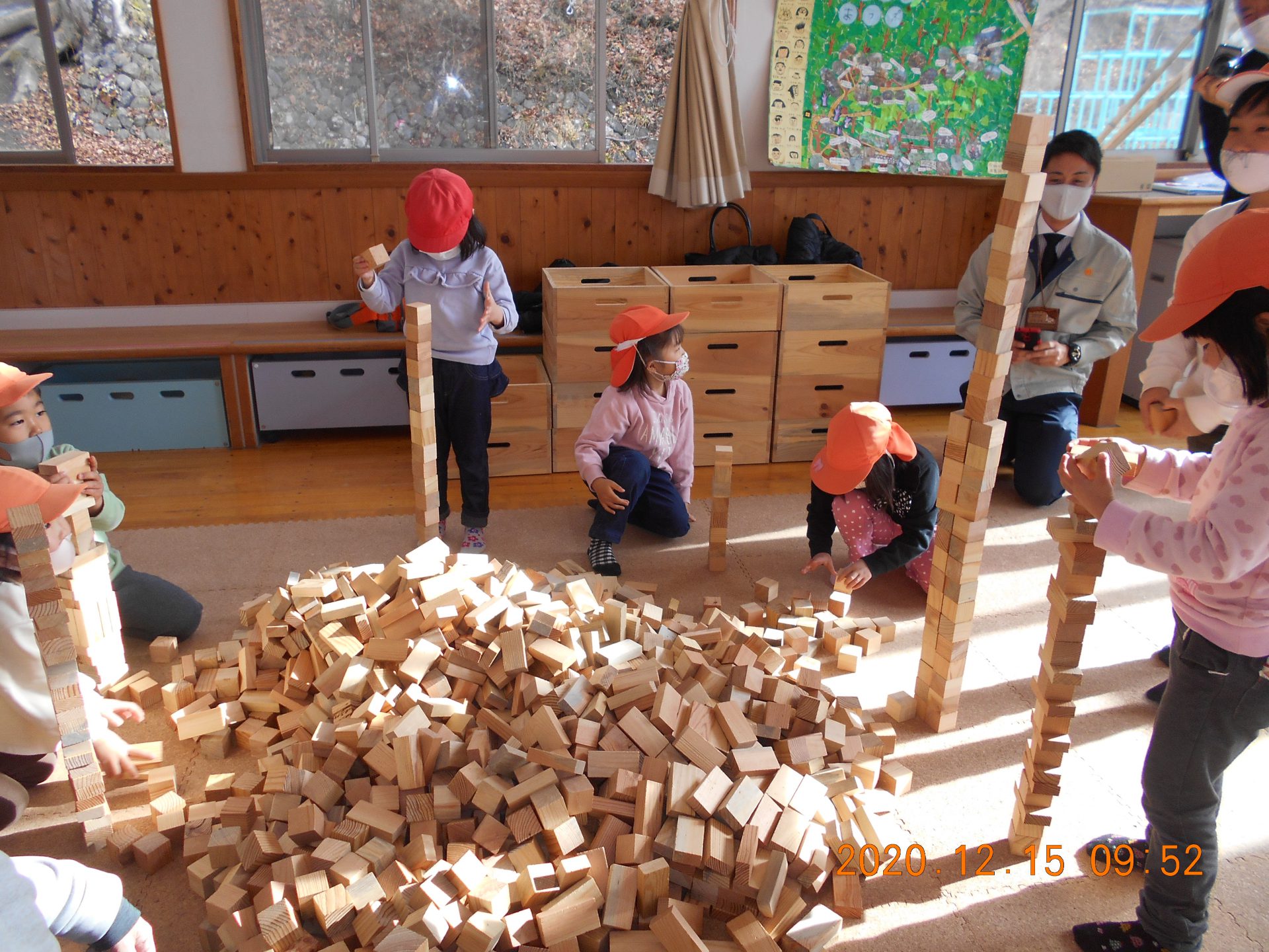 赤松が松枯れし、その木が積み木になることを知った子ども達、松枯れをより身近に感じる環境のため、より興味深く関われる活動でした。たくさんの積み木に興奮し一人一人が考えて無言で集中していました。自分の好きなように作ることに没頭し充実感や達成感がもてた活動でした。