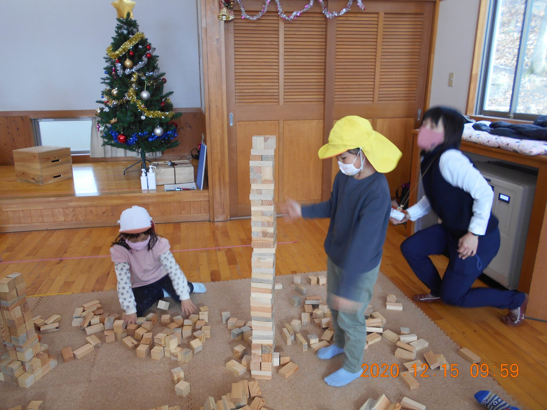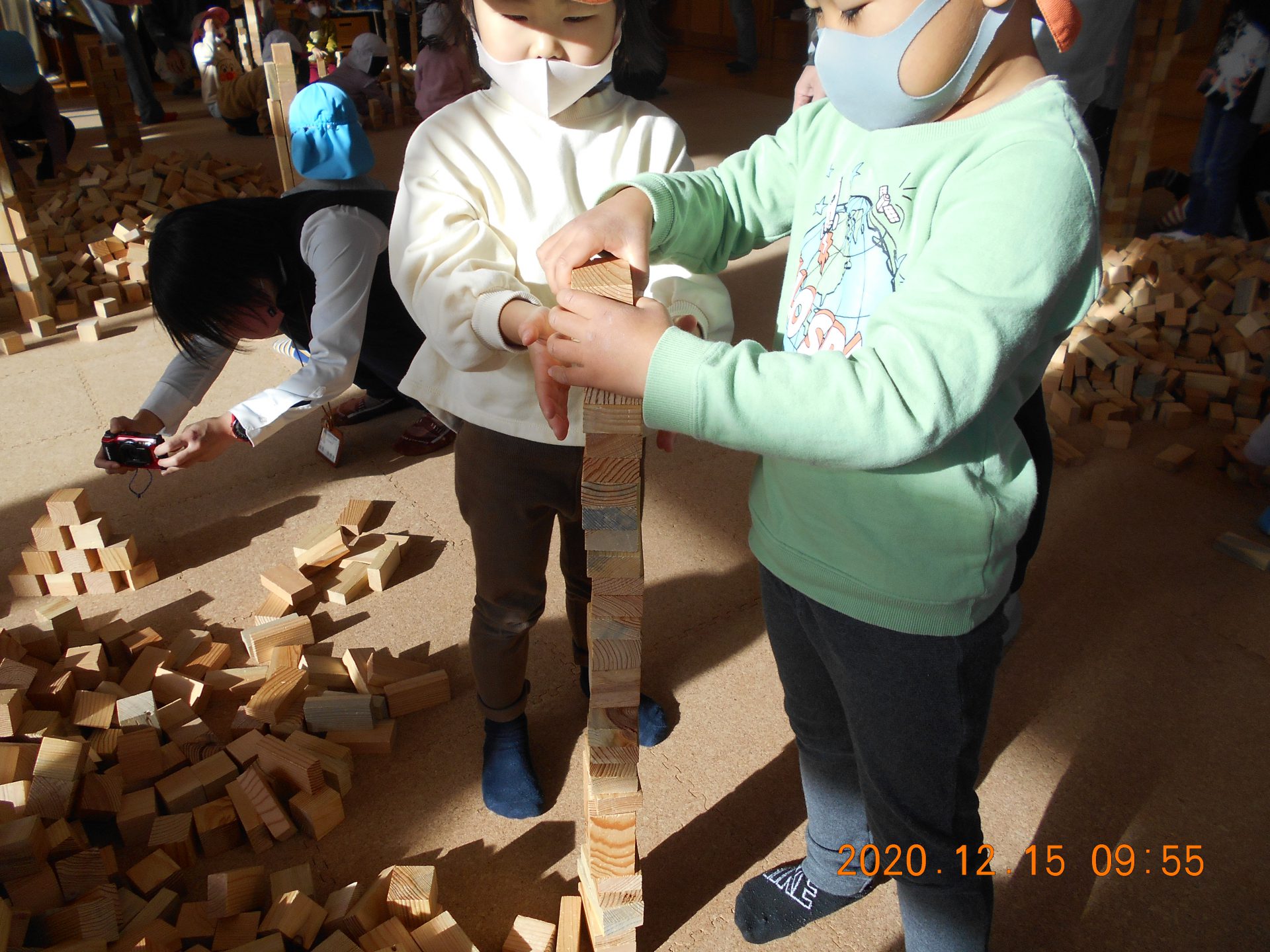 まず最初は、自由な方法で高く積むだけの遊びです。子ども達は、神経を研ぎ澄まし集中!!
