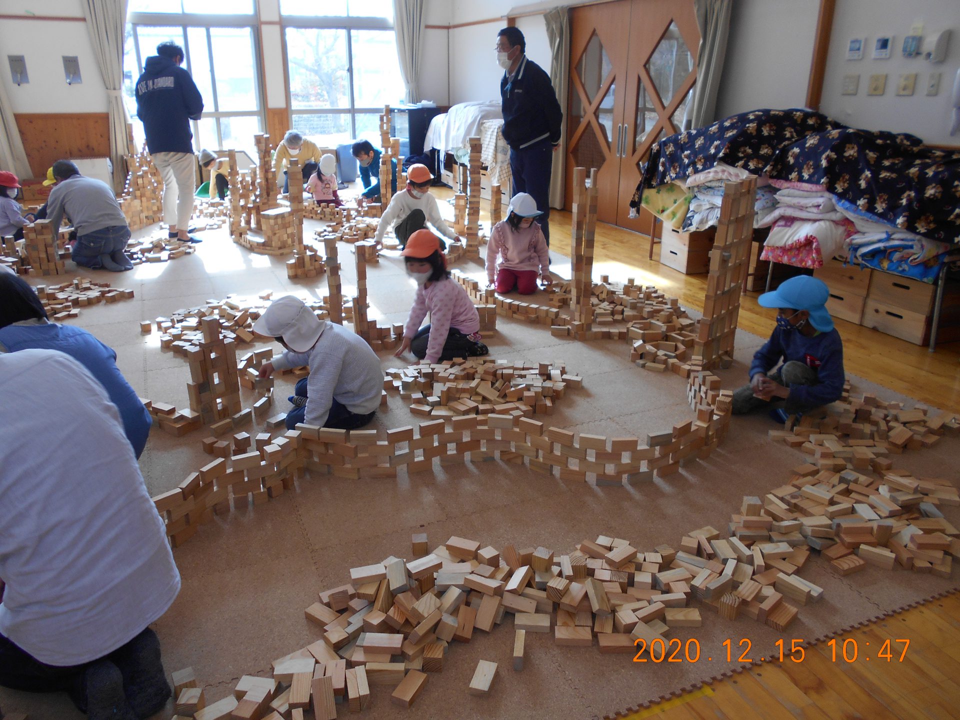 みんなの積み木がつながりました!!大きな町の完成です!!