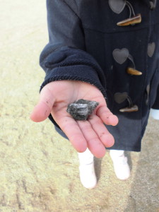 霜柱屋さんで 霜柱を買った男児 霜柱を手にして「冷たい。」と手の平の上で霜柱が解けるのを