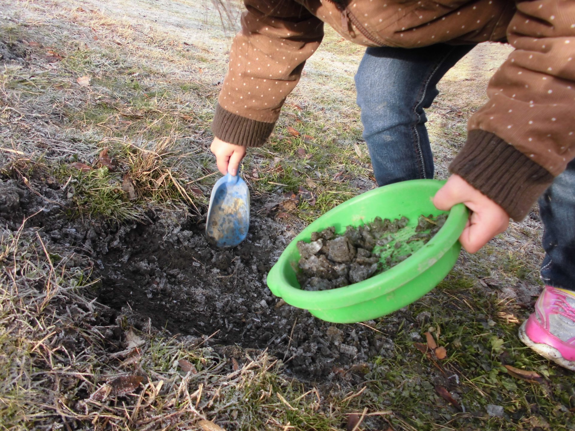 「そうだ! 霜柱屋さんしよう!」 すべり台の下に並べられた霜柱。