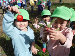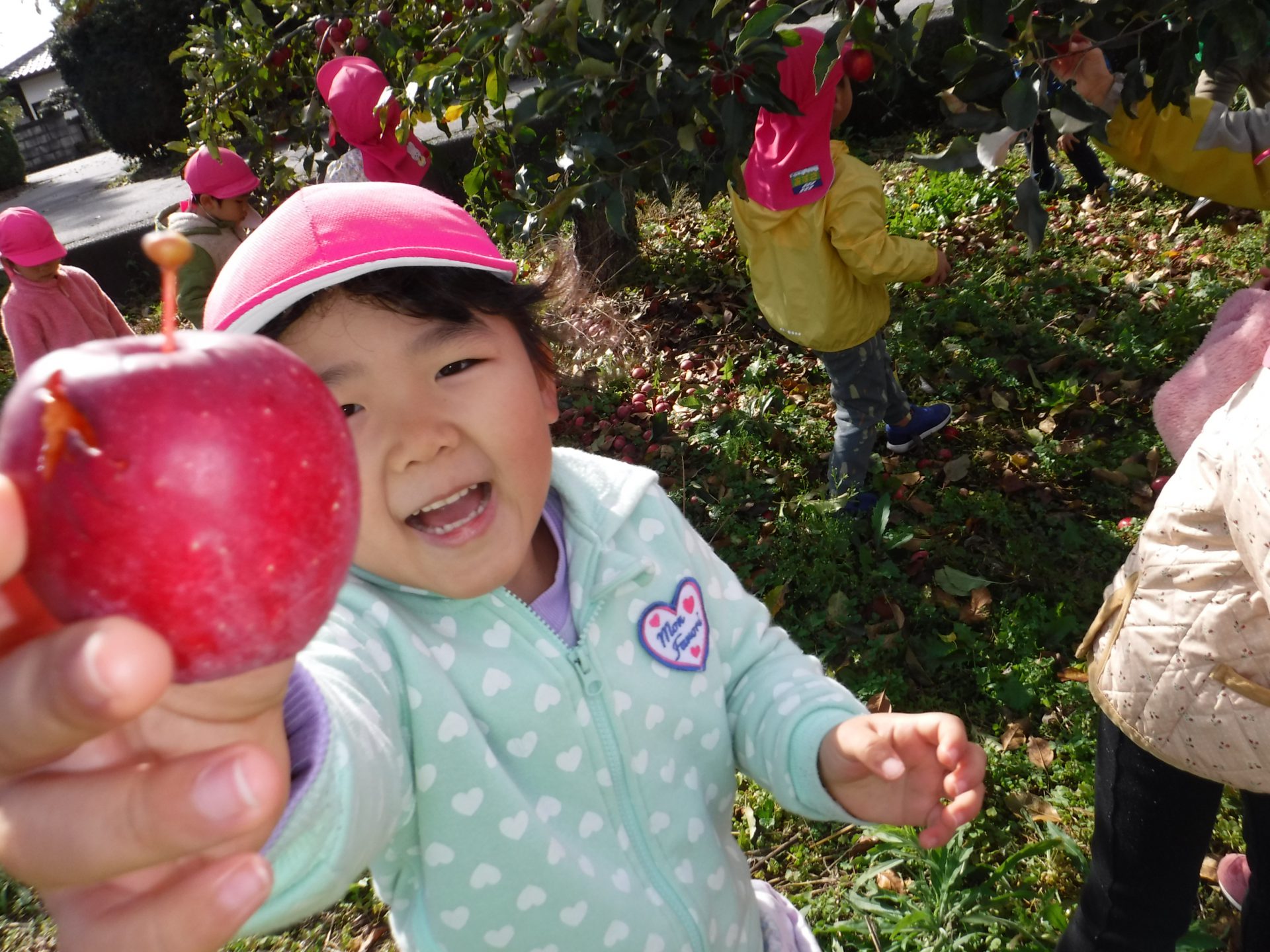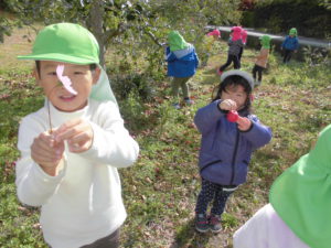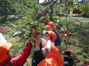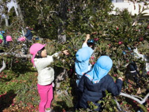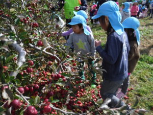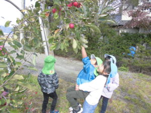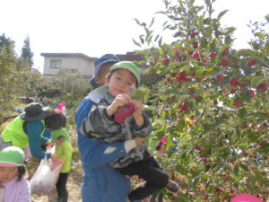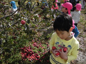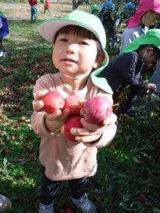 実がなっているのも、子どもの手がちょうど届く高さ。2歳さんも手が届き、どの子も夢中でりんご狩りをしていました。