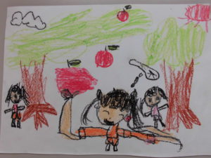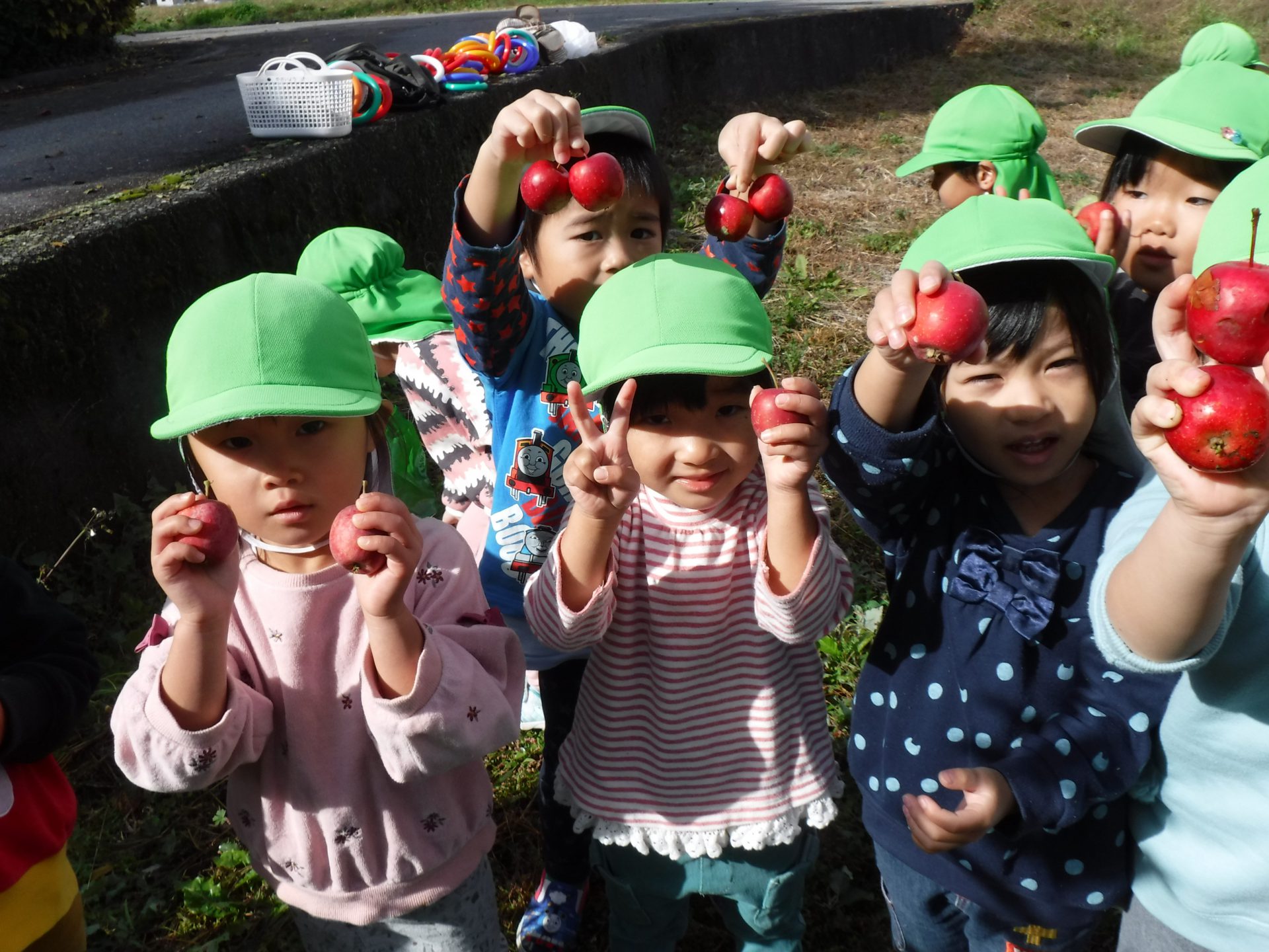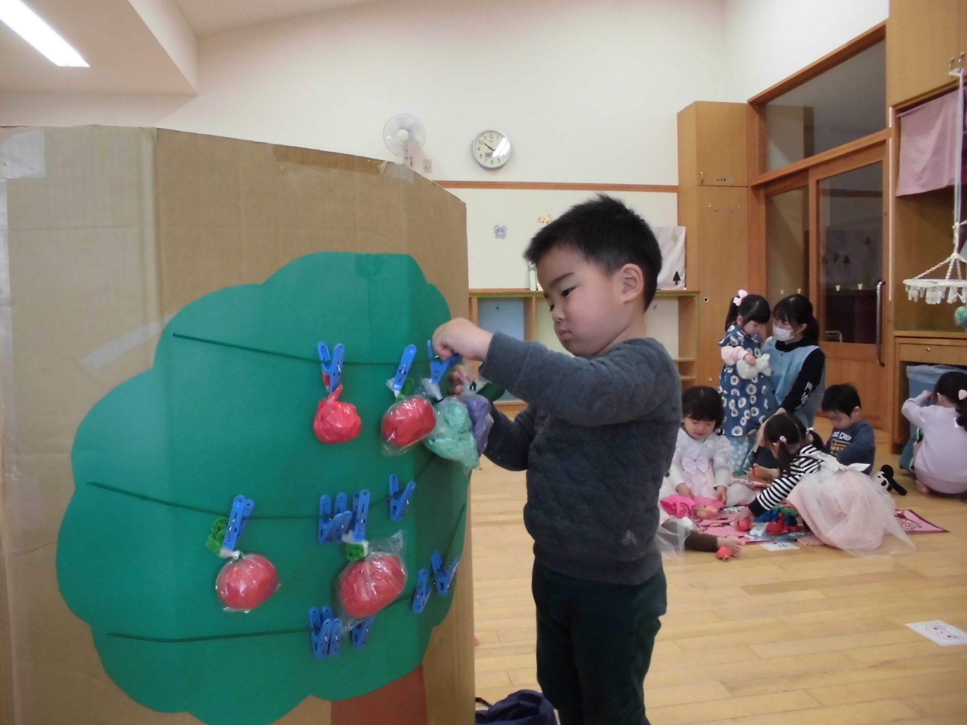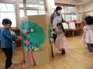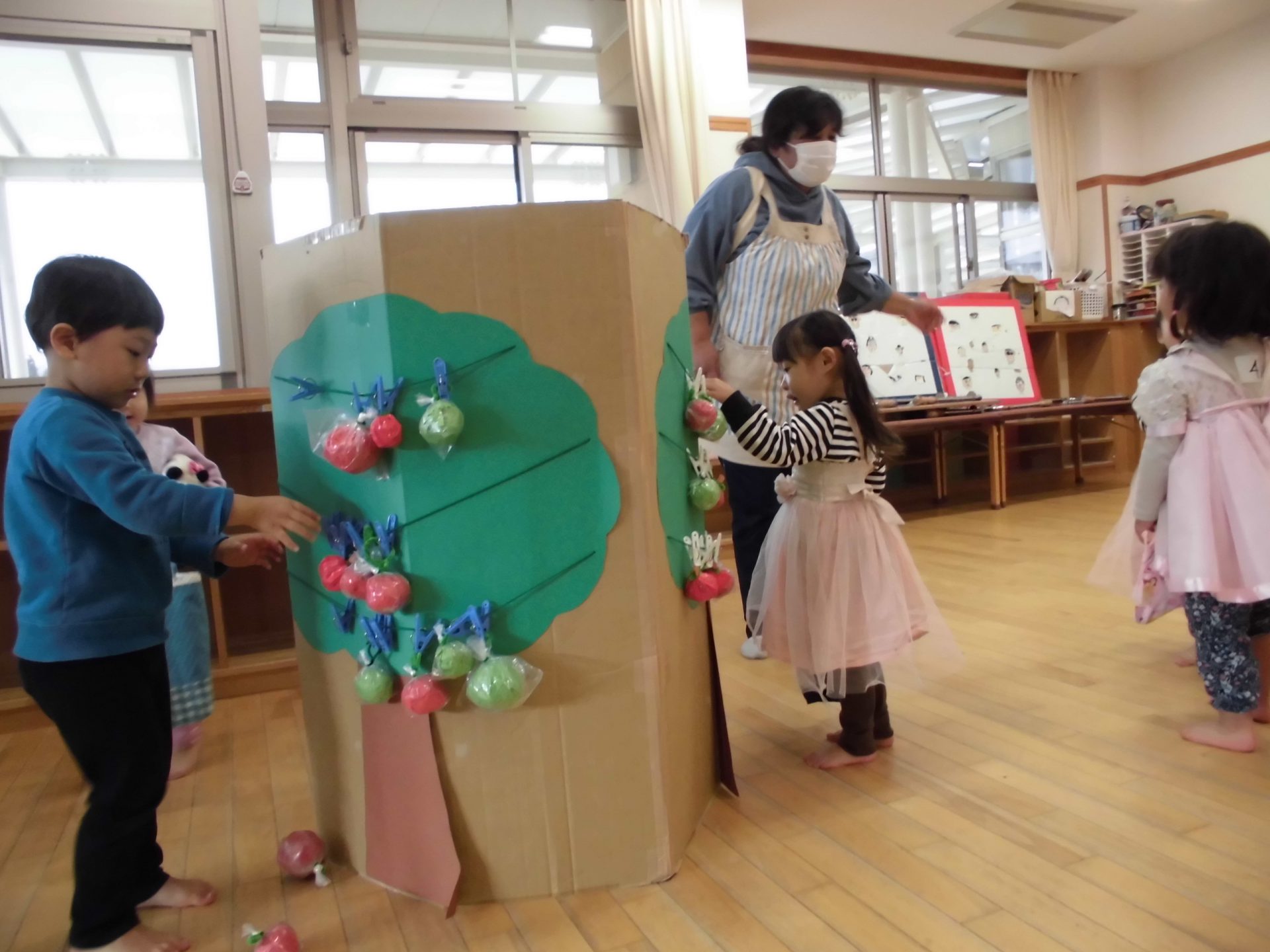 2歳児クラスは遊びの中で、りんごがりごっこを楽しんでいます。
