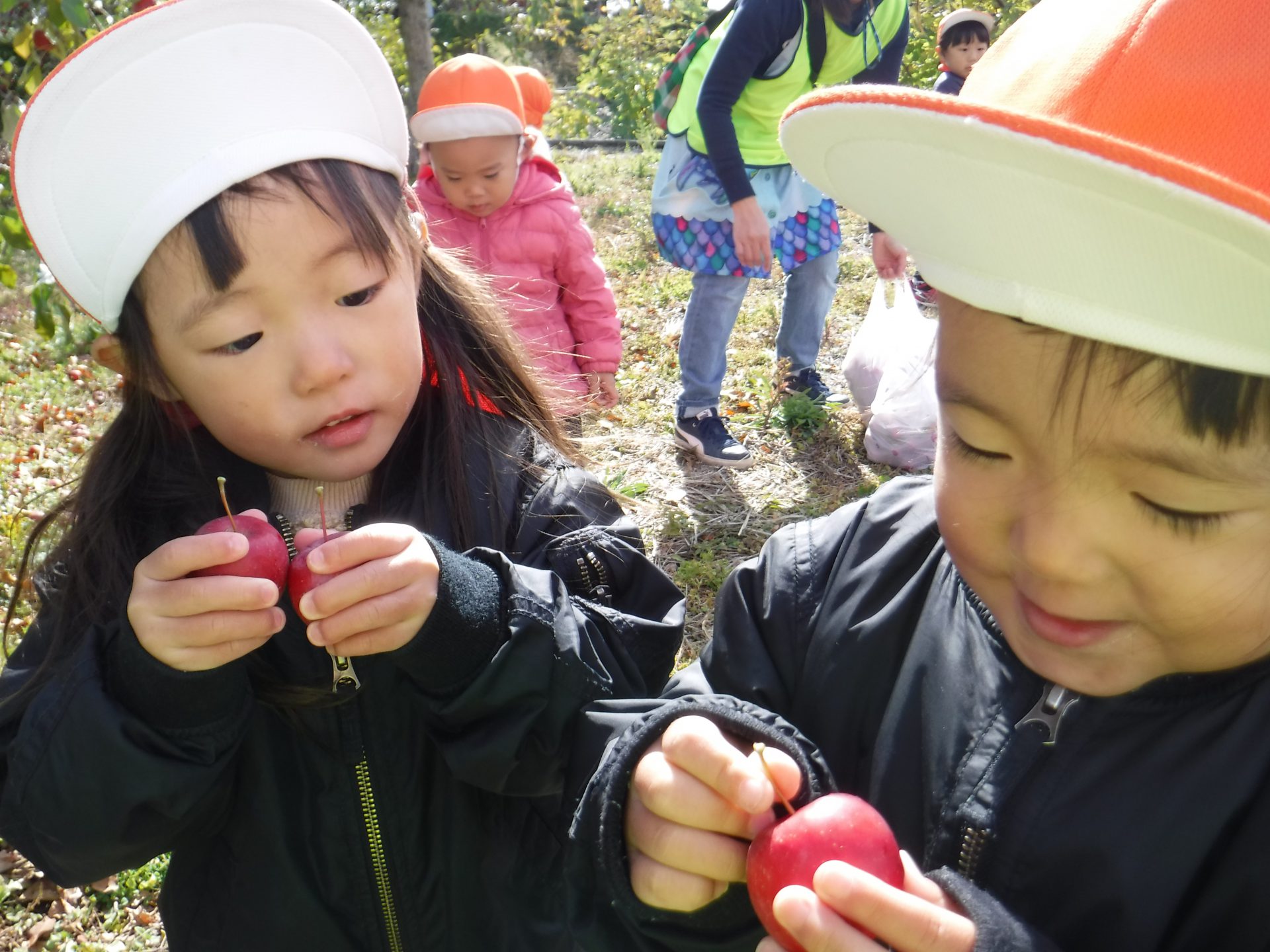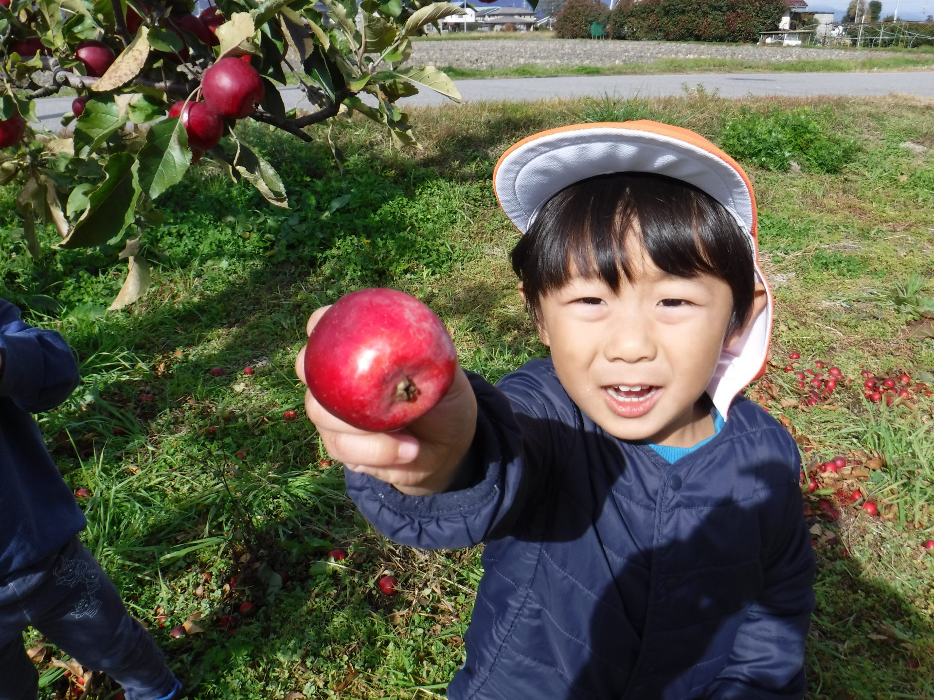 りんごが取れたことも、抱っこしてもらったことも、両方とも嬉しそうです。