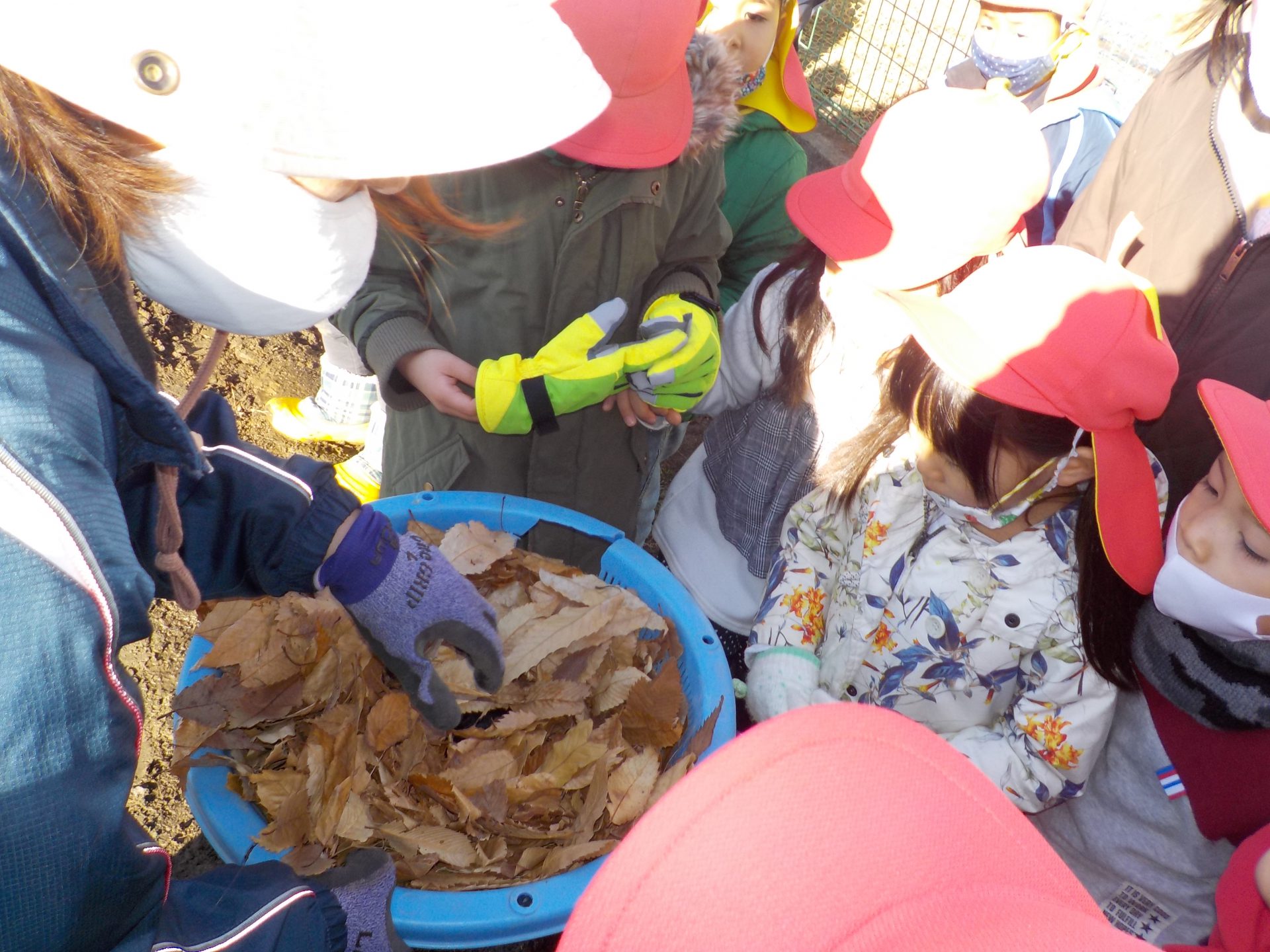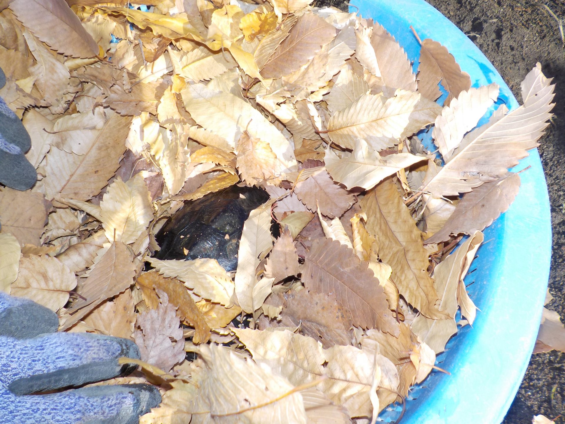 みどりちゃんを、落ち葉を敷き詰めたざるの布団に寝かせました。
