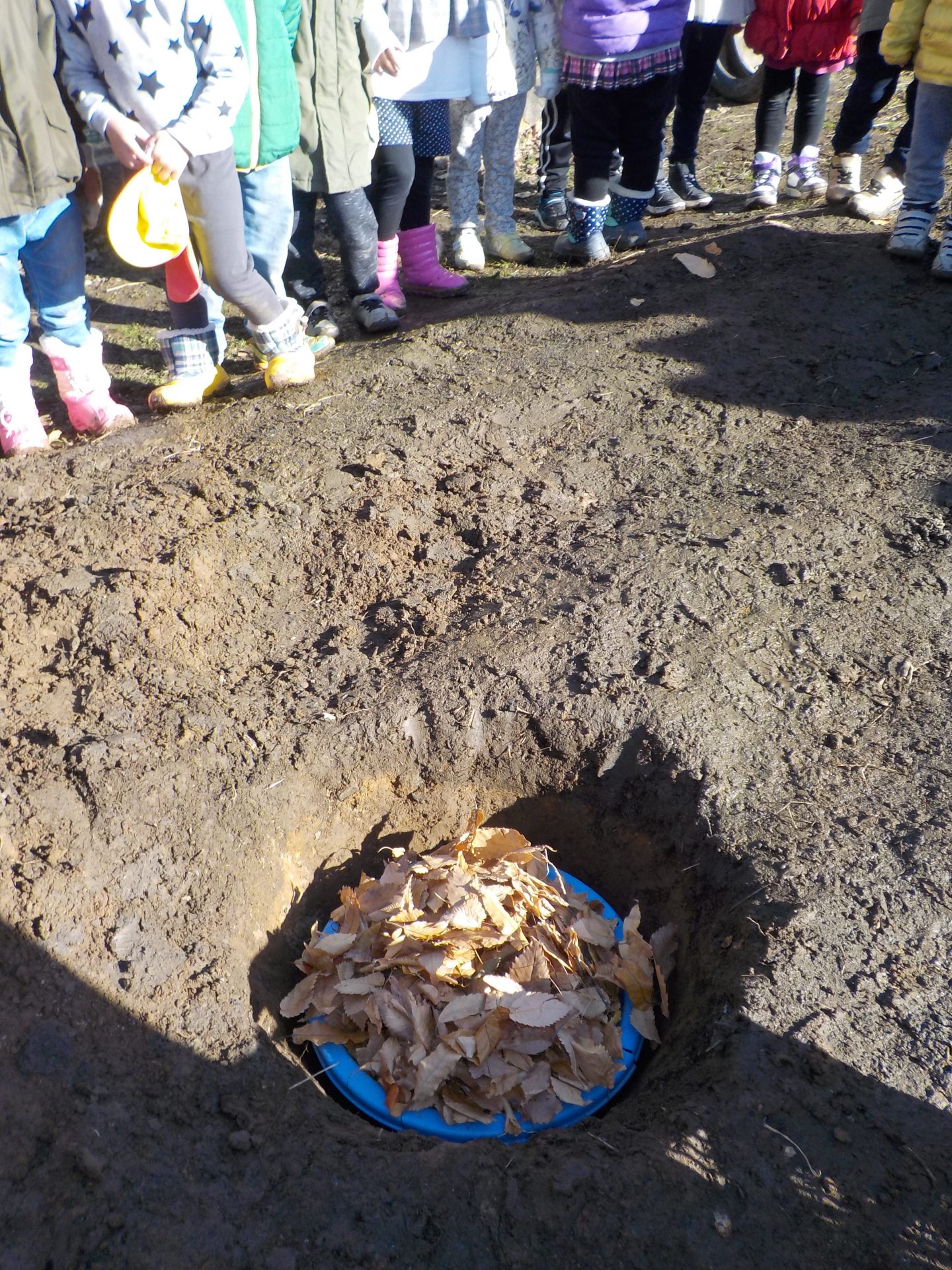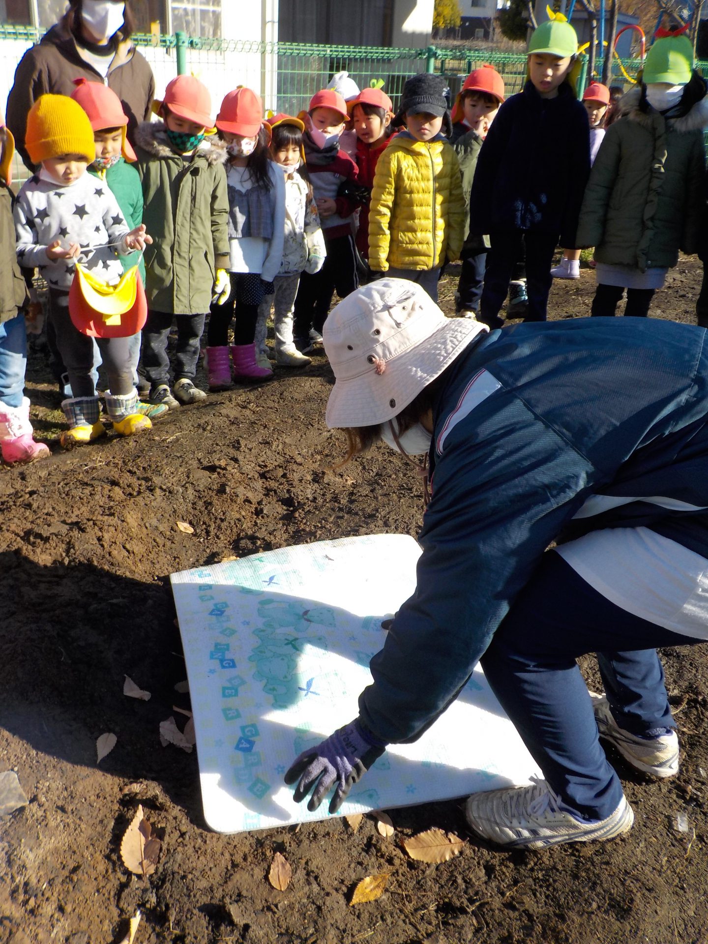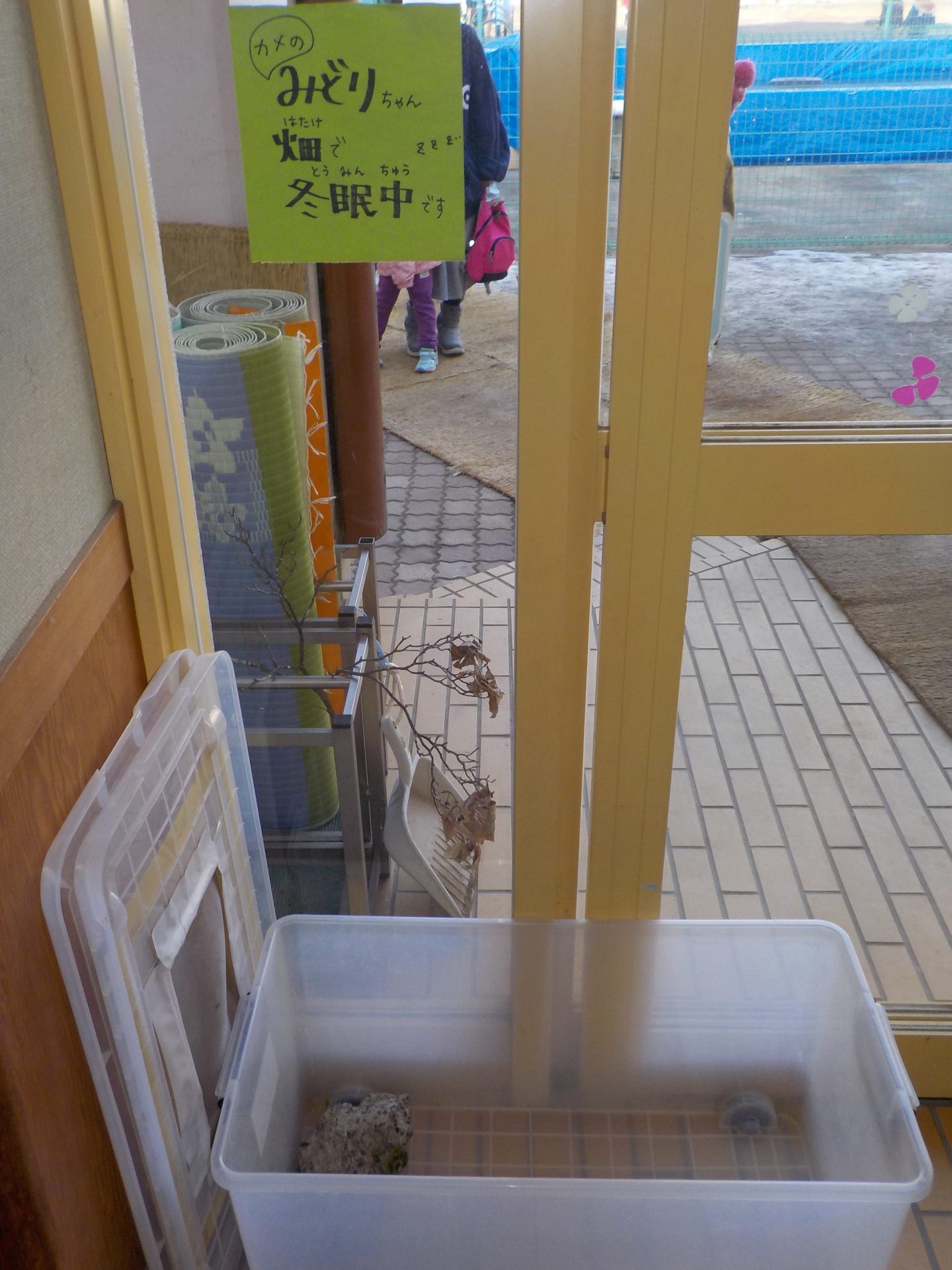 例年、冬もいつも通りすごしていたみどりちゃんですが、今年度のカメ係の保育士が、「カメは冬眠しなくてよいのだろうか」ということに気付き、子ども達と相談して、カメの『おやすみ式(冬眠式)」を行うことにしました。