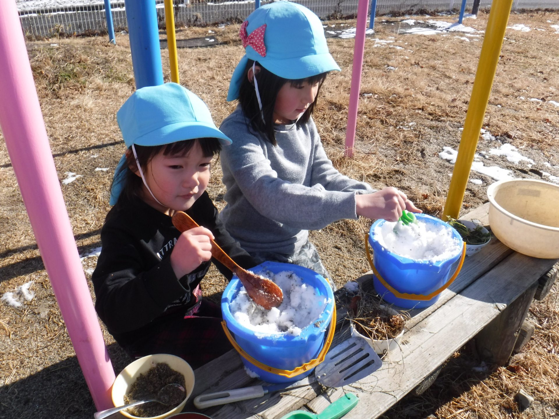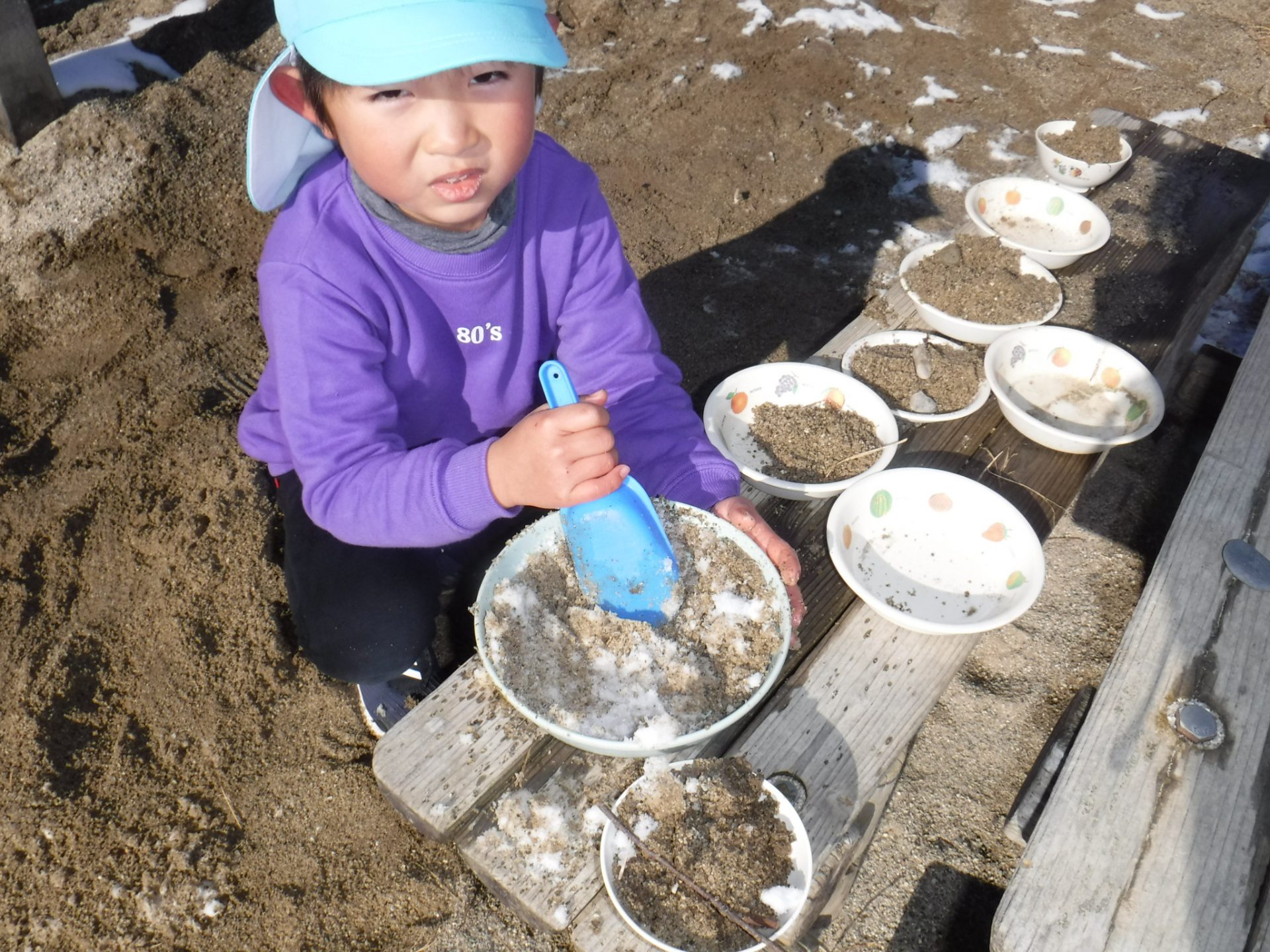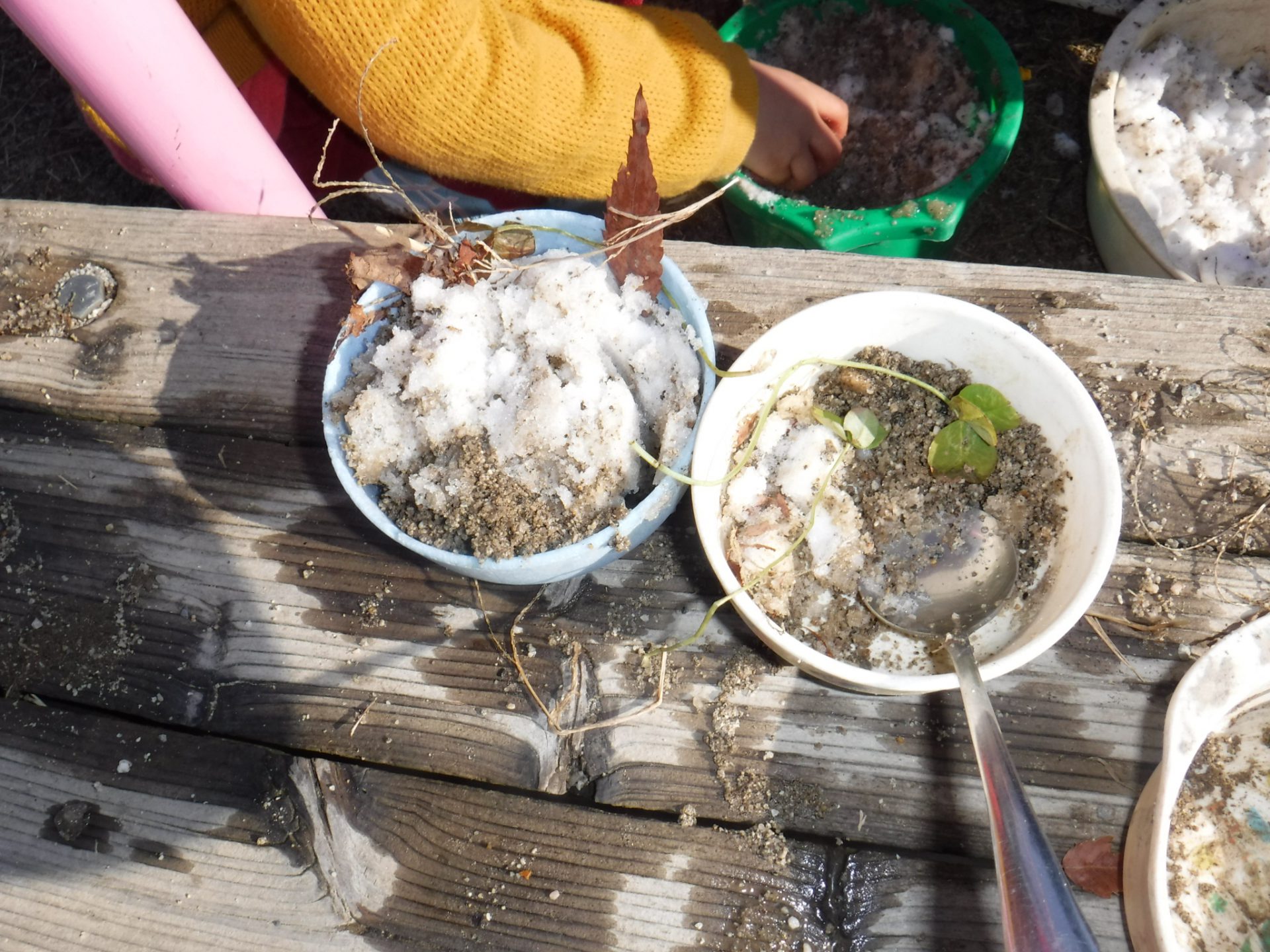 わずかに積もった園庭の雪でたくさん遊んだ子ども達。土と混ぜることで見えてくるもの、想像できるもの、葉っぱや砂を加えて色々な物に見立てて遊んでいました。