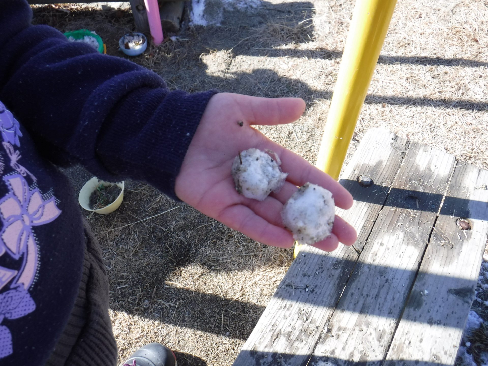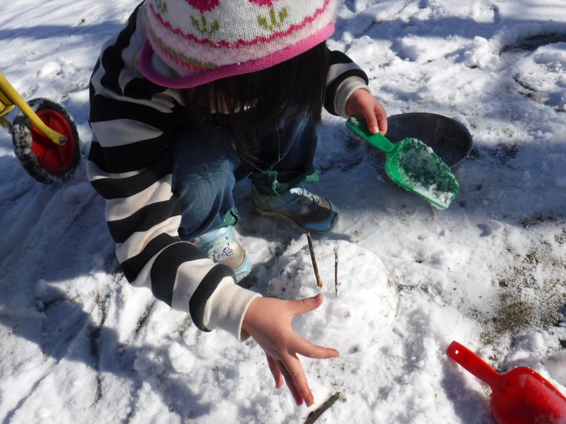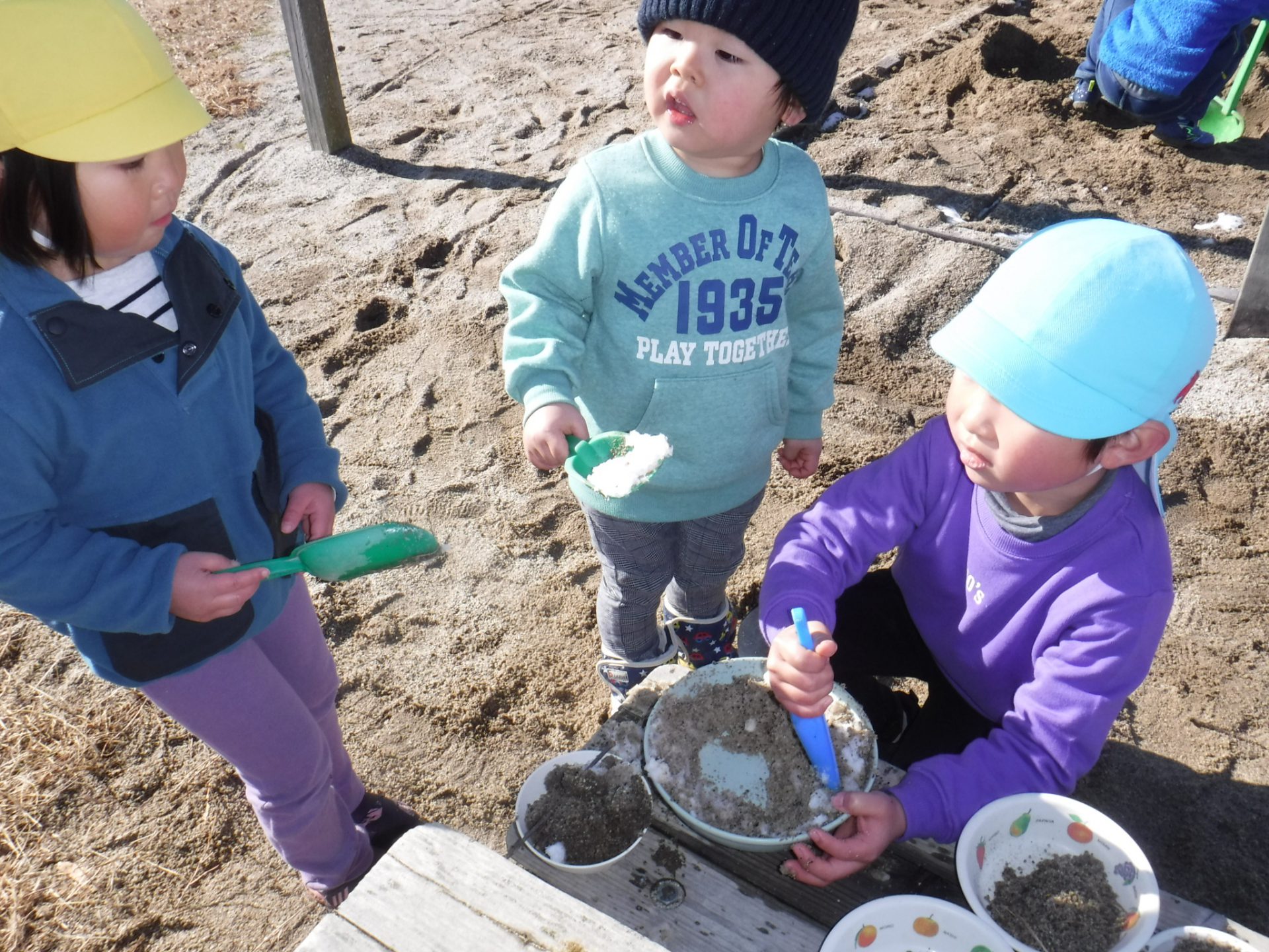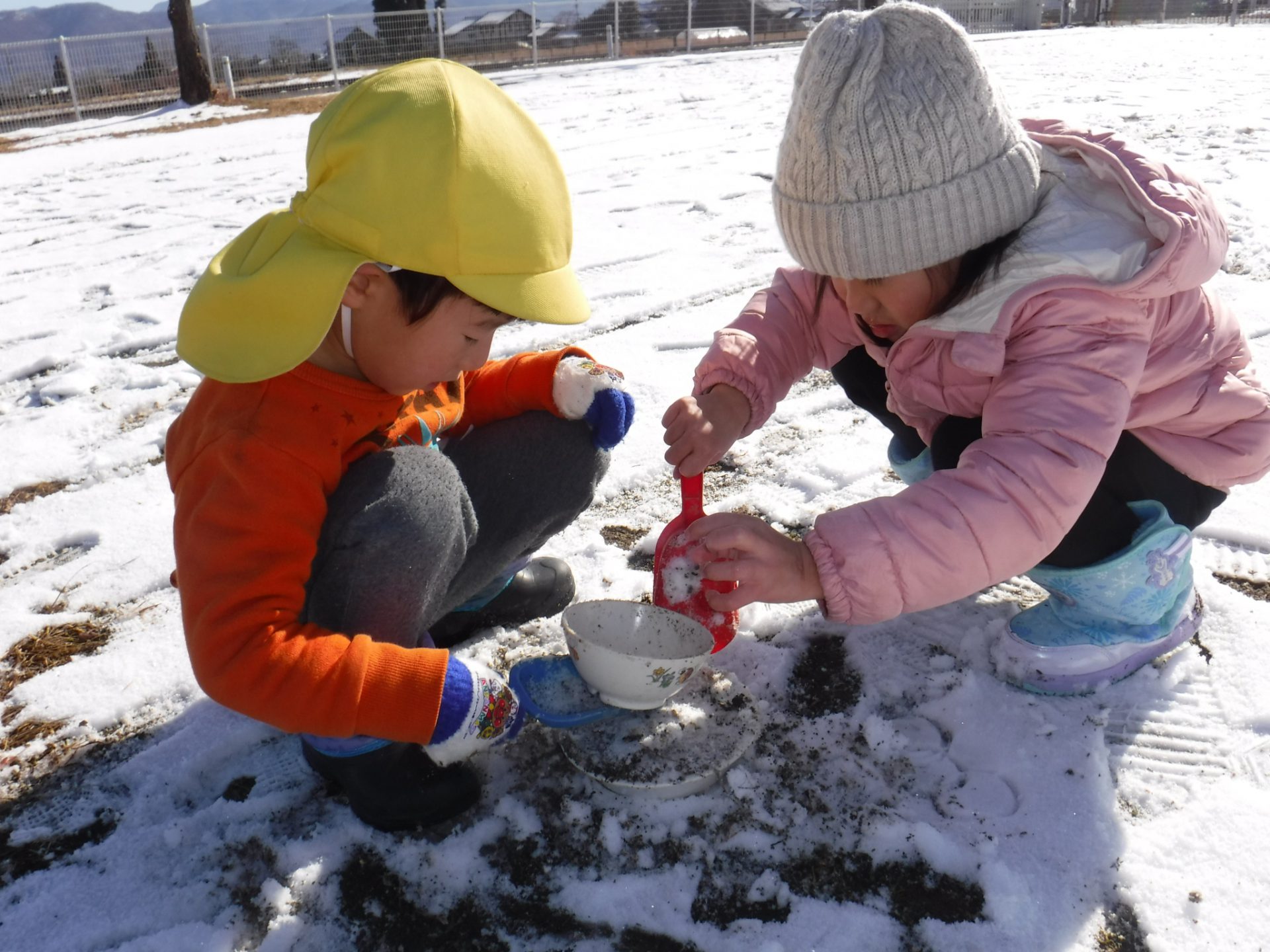 わずかに積もった園庭の雪でたくさん遊んだ子ども達。土と混ぜることで見えてくるもの、想像できるもの、葉っぱや砂を加えて色々な物に見立てて遊んでいました。