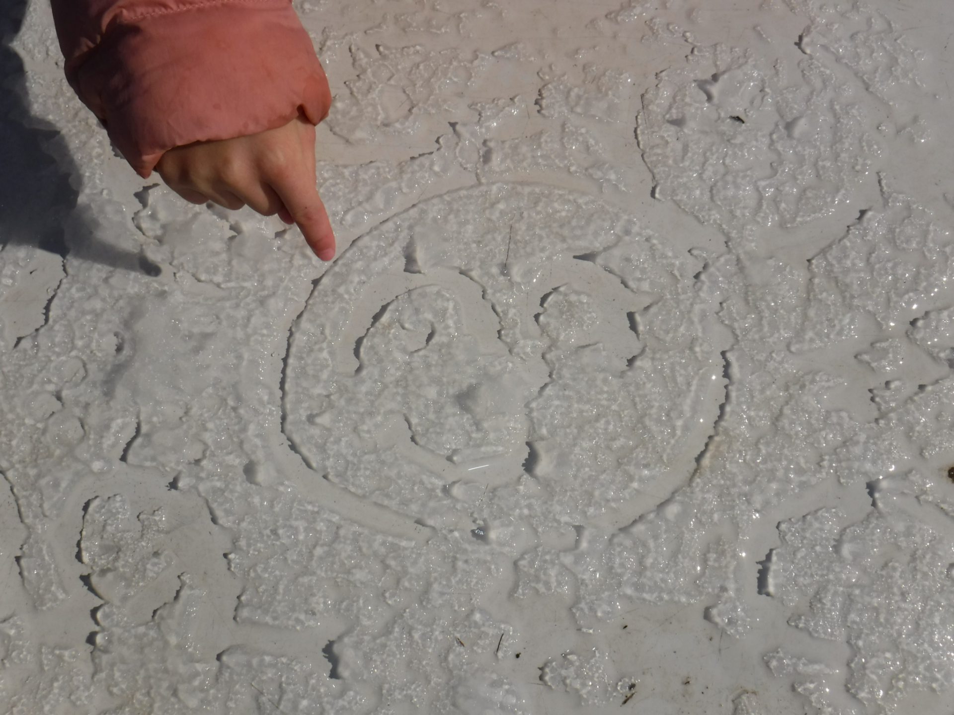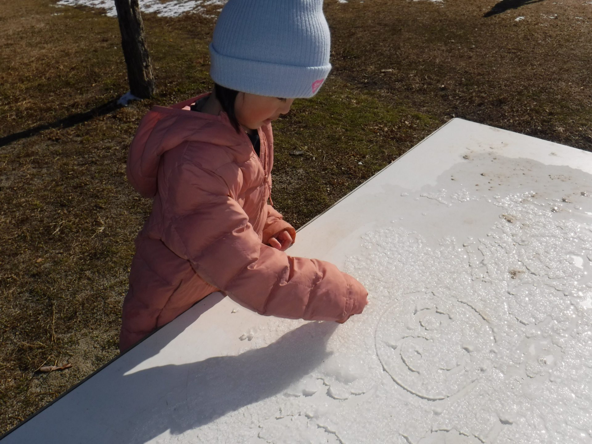 「雪でもお絵かきできるんだね。」「透きとおっているのに雪みたい。」