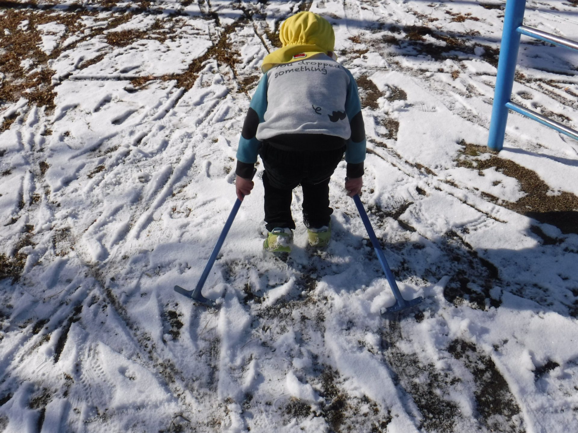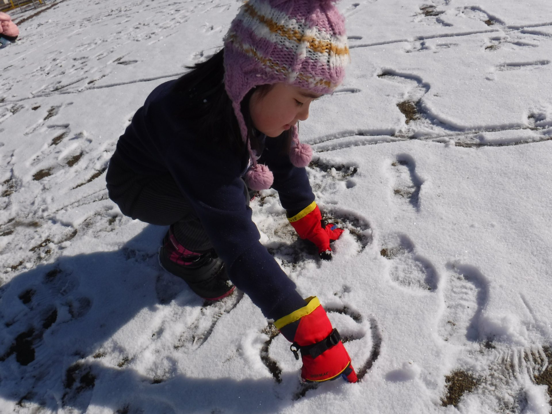 園庭に薄く積もった雪を見つけて大喜びの子ども達。