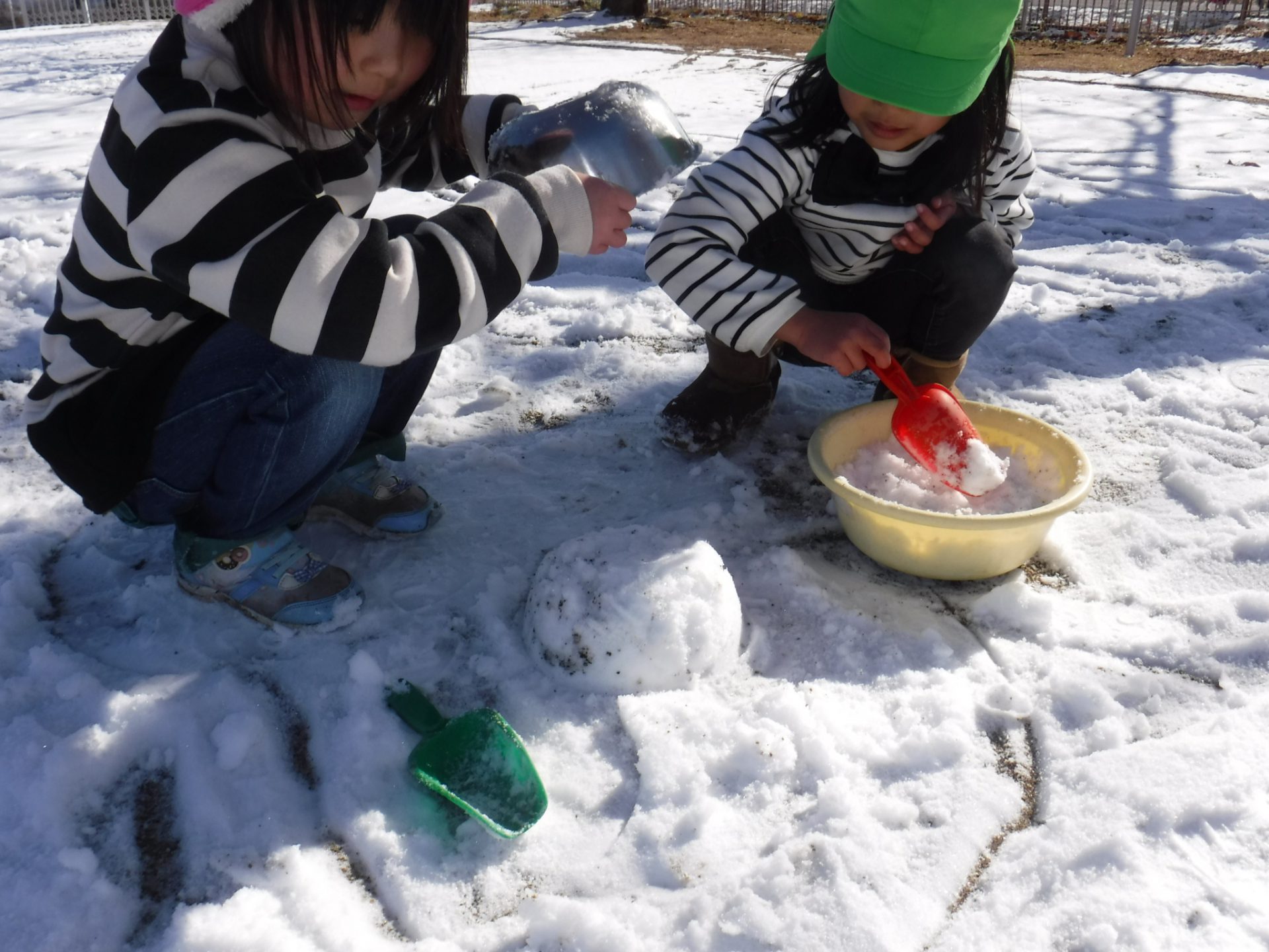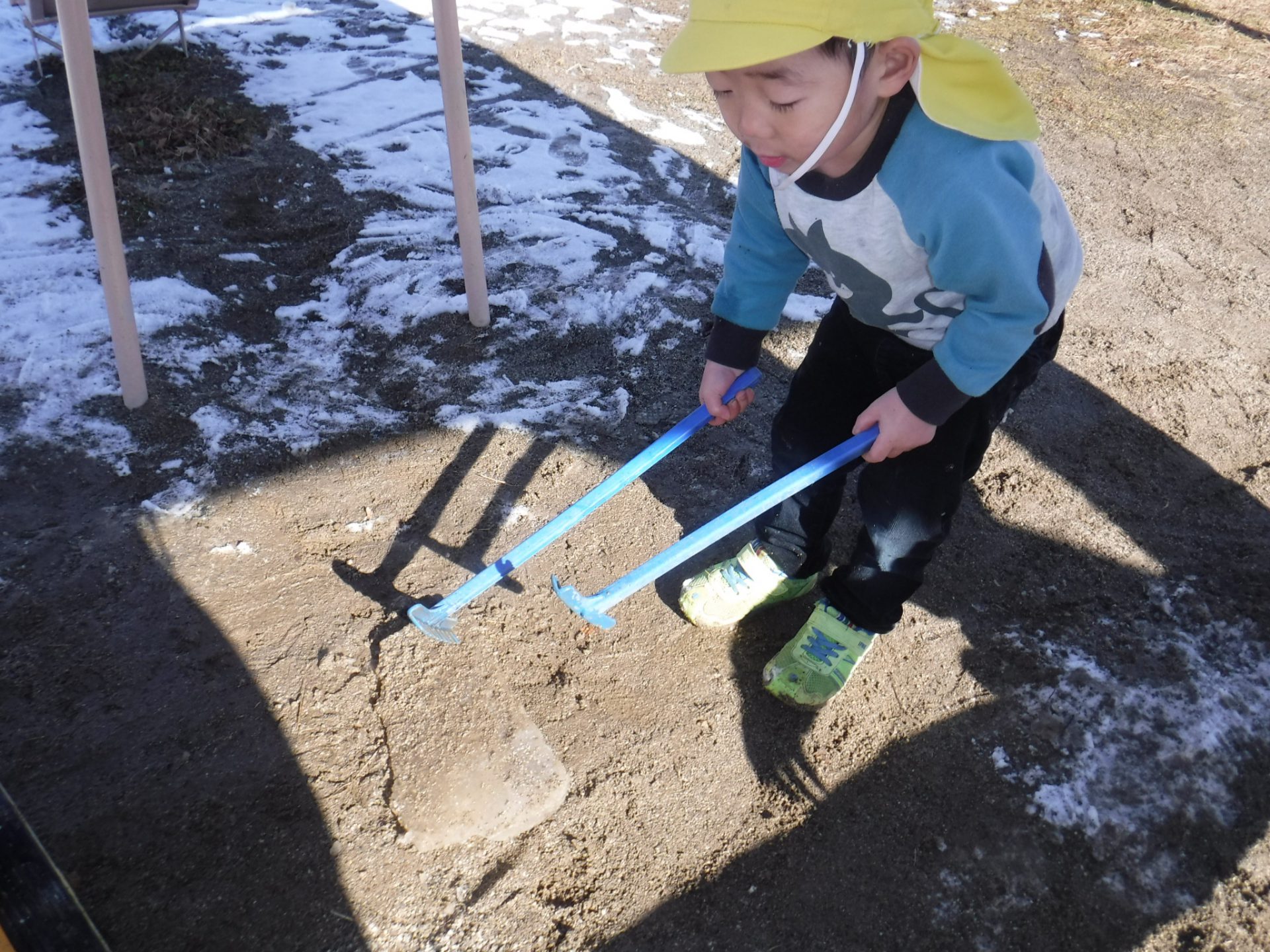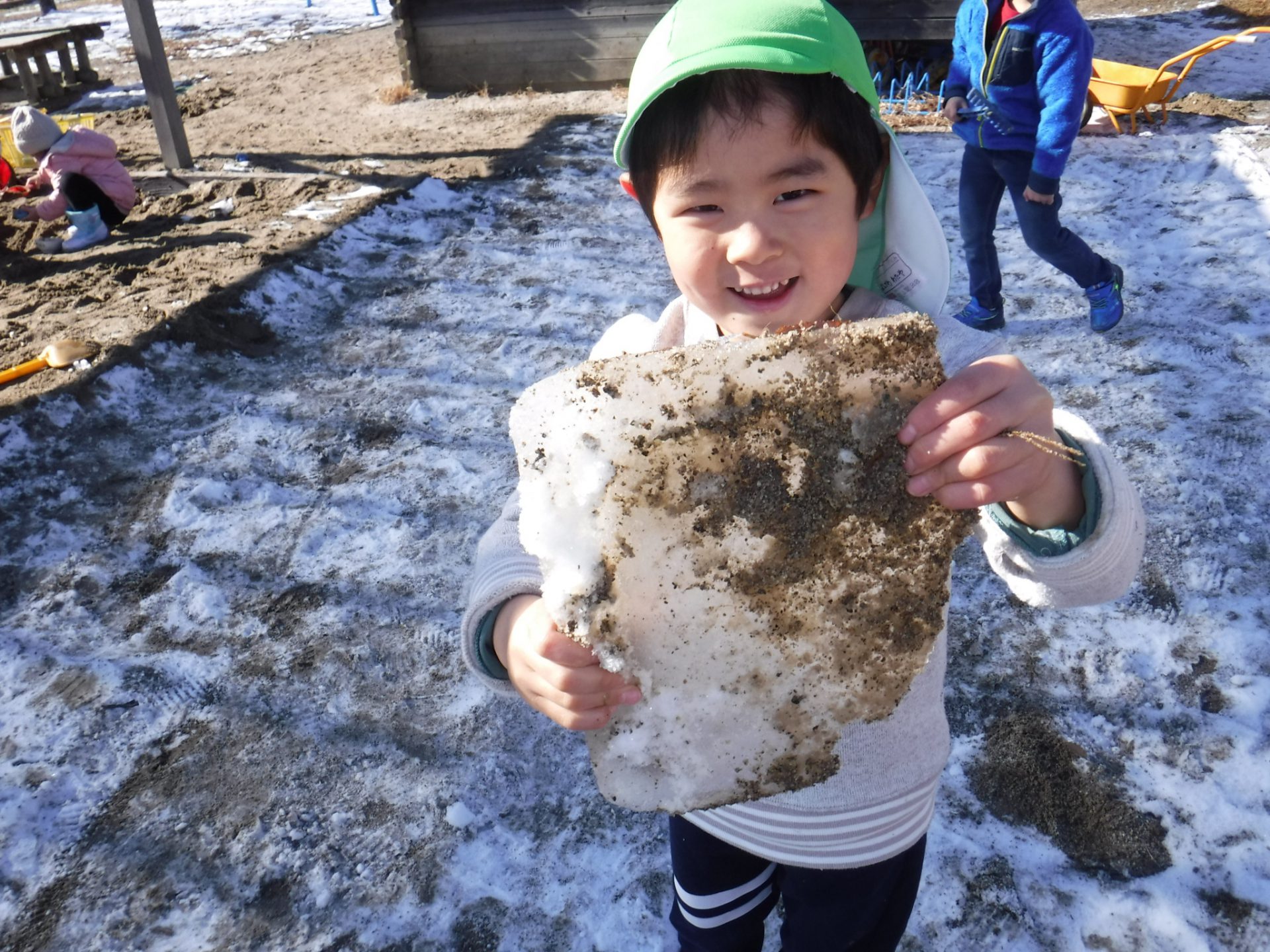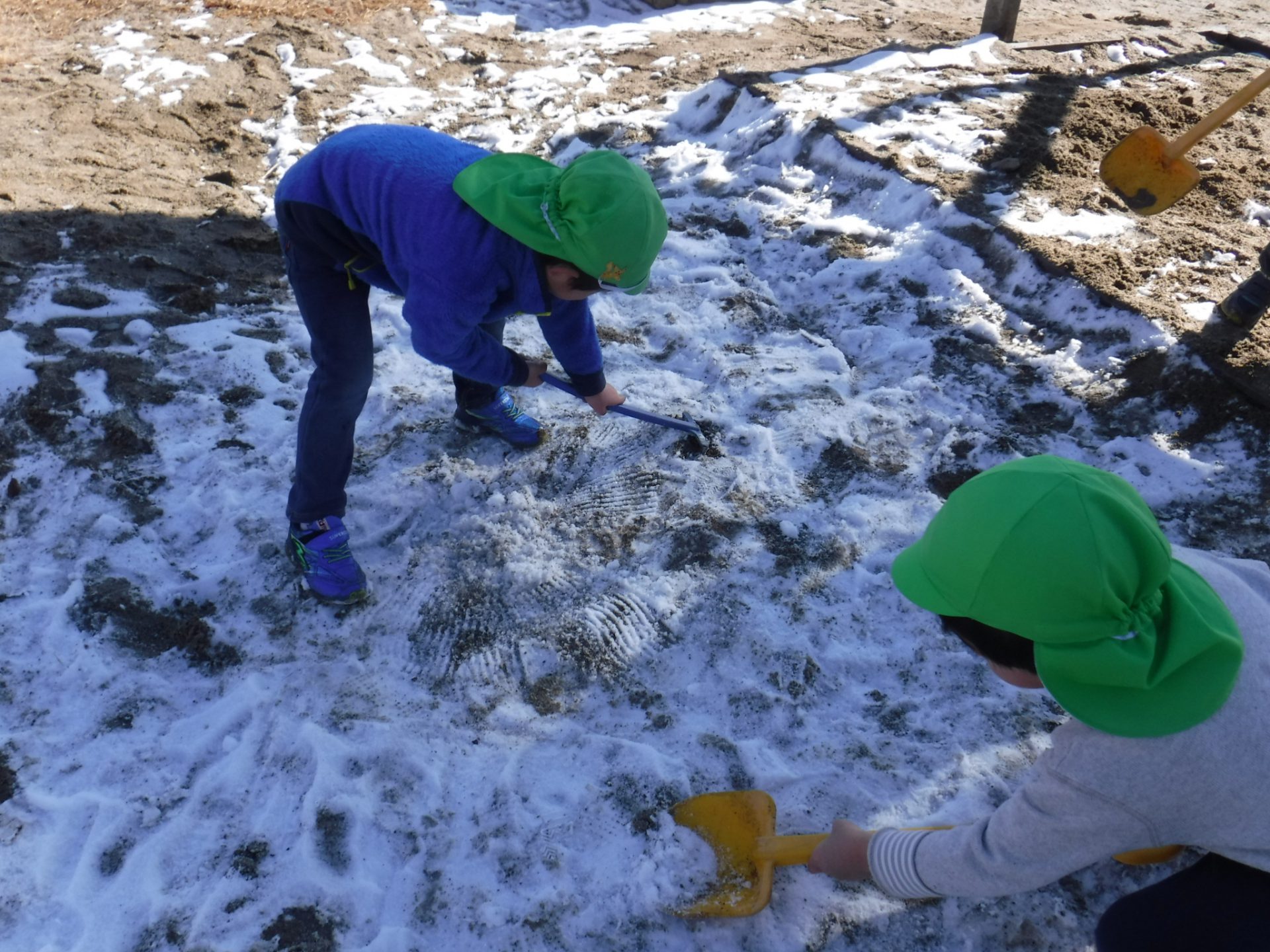 雪を固めるとケーキのようになる事、スコップで切ると小さなかたまりになる事、また氷のかたまりを小さくして並べてみるとことで氷の性質や溶けることなどを手で触り感触を知り、見て感じる事のできた雪遊びでした。