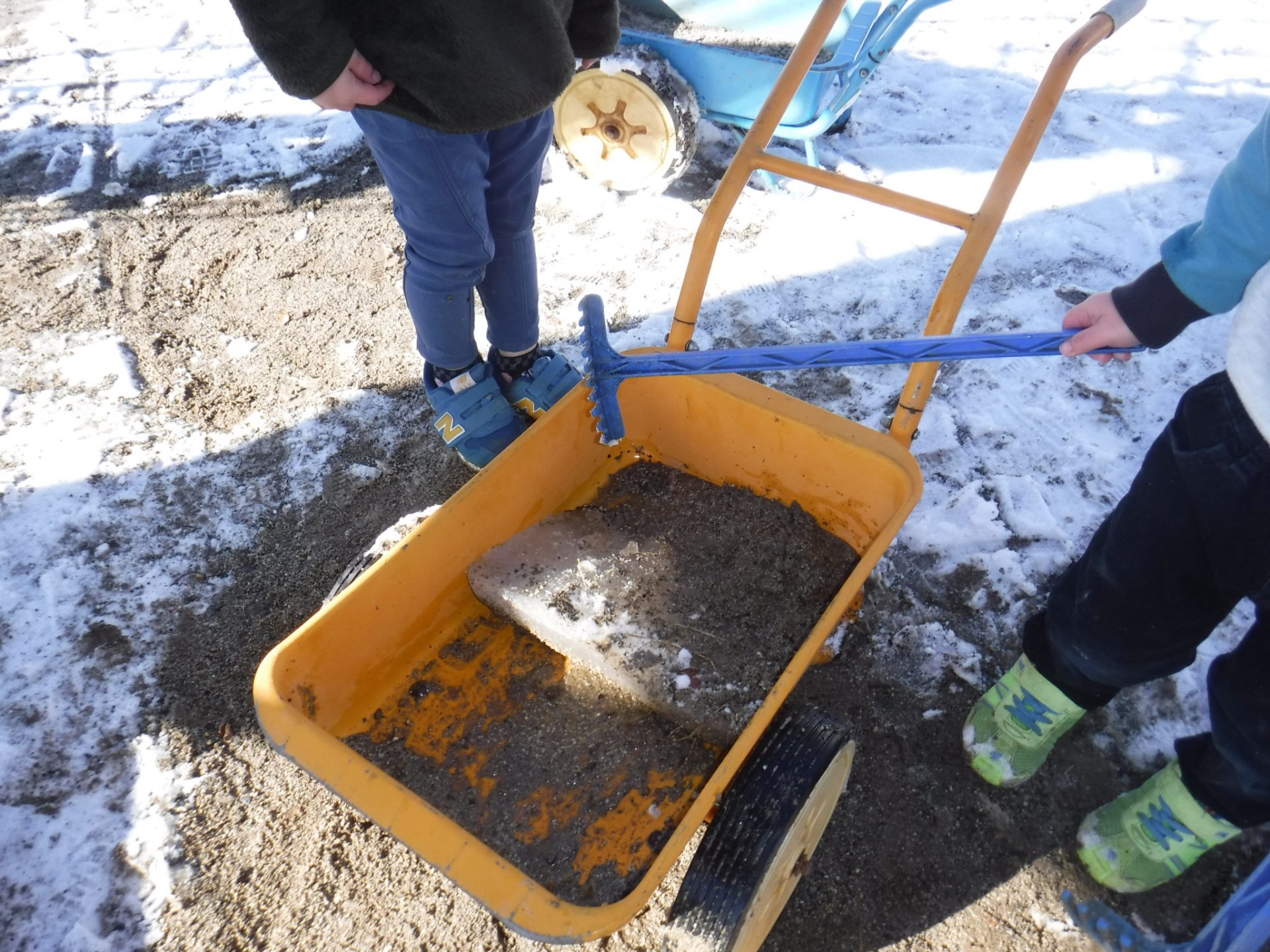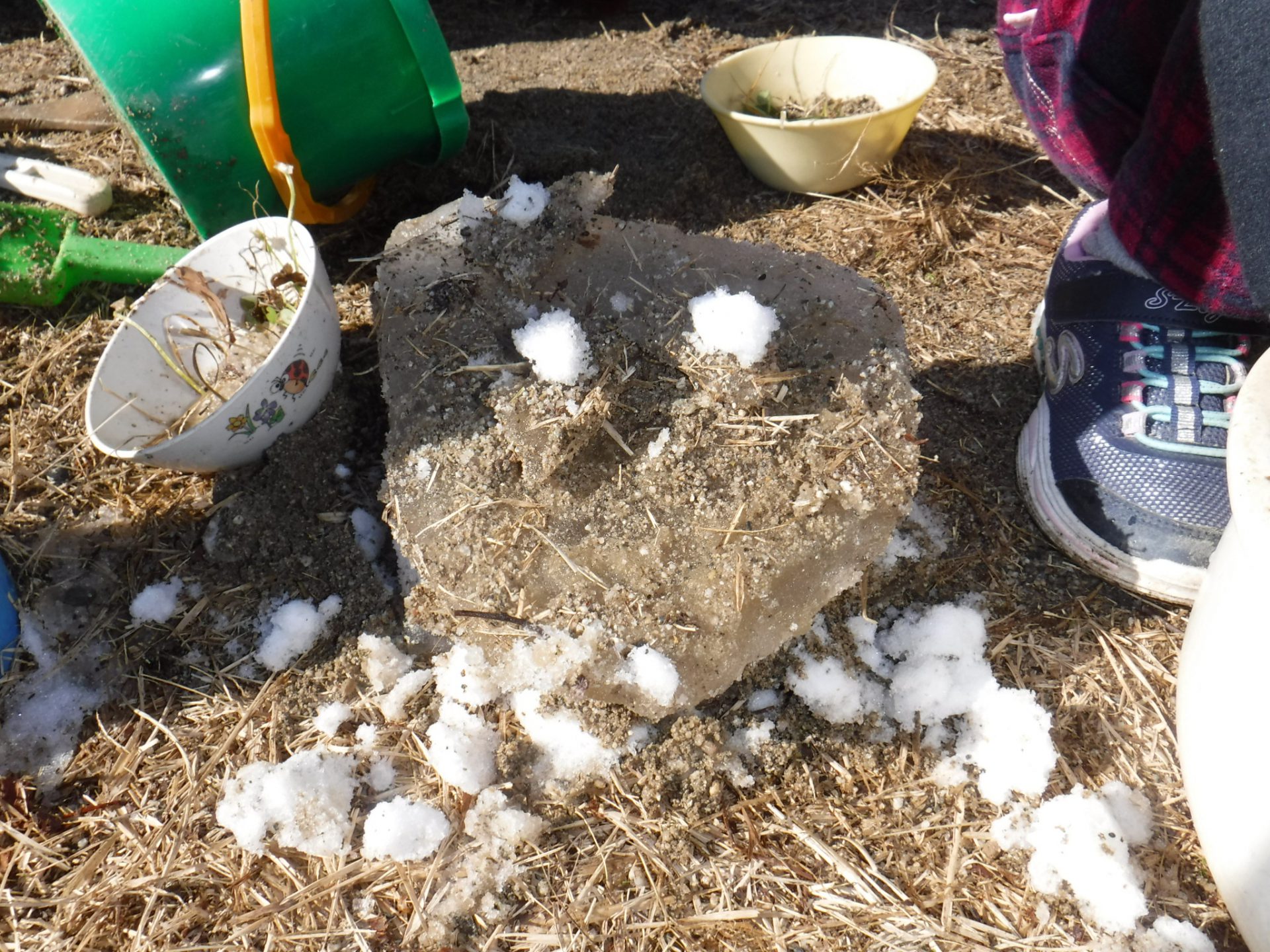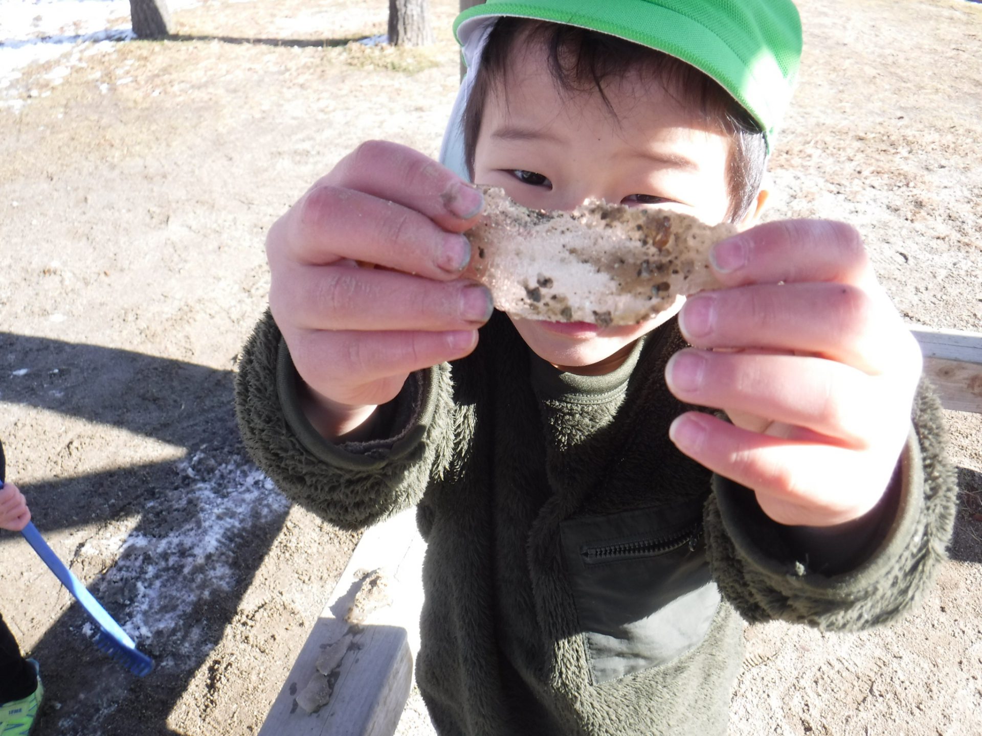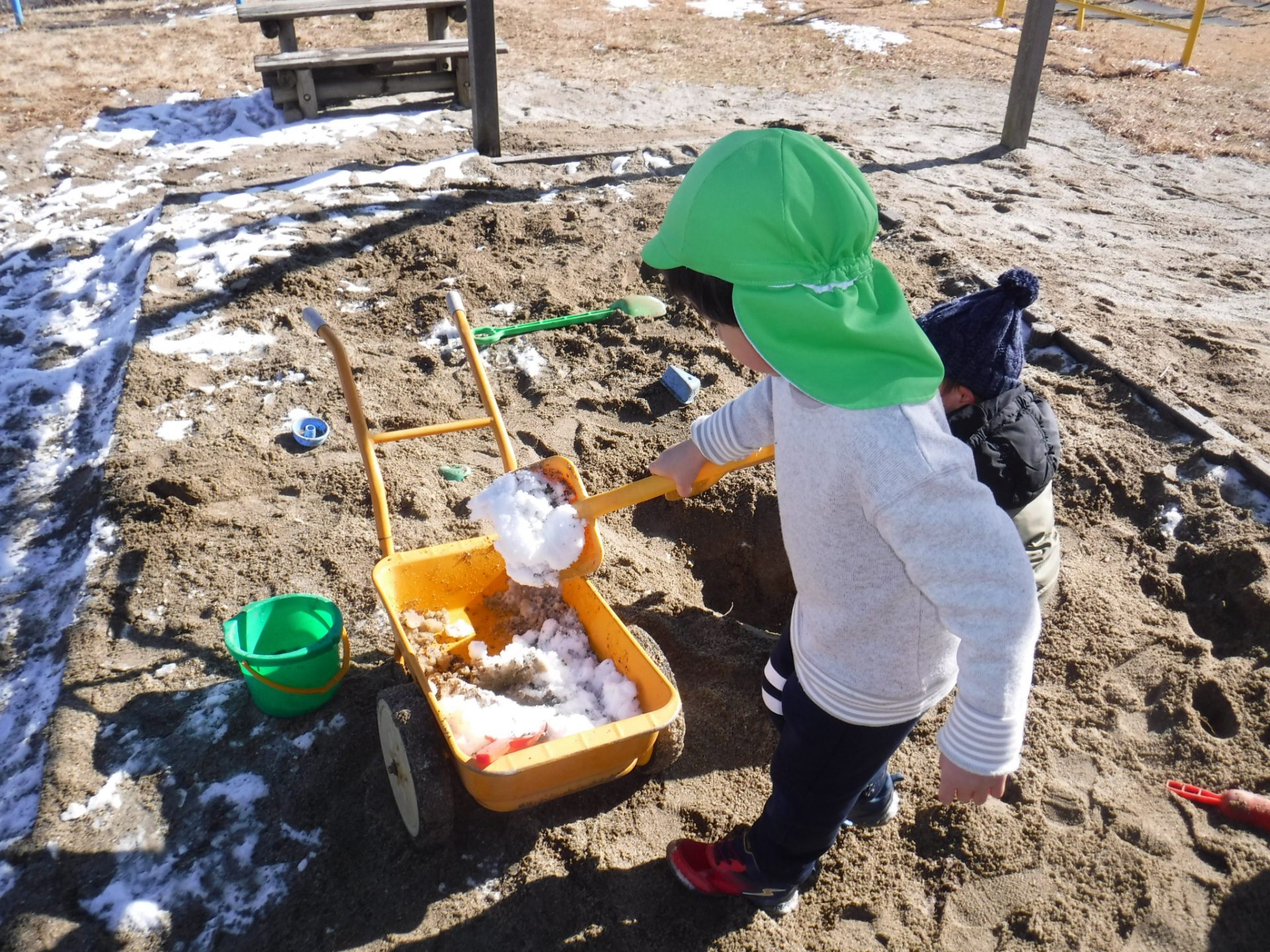 雪を固めるとケーキのようになる事、スコップで切ると小さなかたまりになる事、また氷のかたまりを小さくして並べてみるとことで氷の性質や溶けることなどを手で触り感触を知り、見て感じる事のできた雪遊びでした。