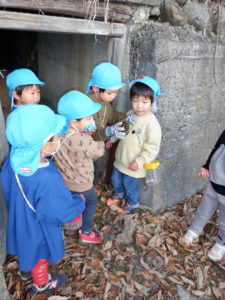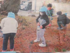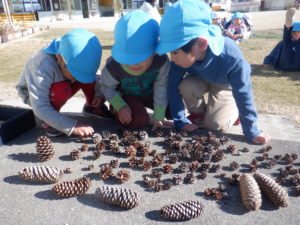 そこで、さっそく年少児がまつぼっくり探しに出かけていきます。