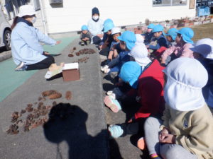 「ねぇ、ねぇ見て、こんなに長いのあったよ!」「トナカイさんおいしいって言うよ。きっと!」事前に保育士が置いておいた大きいまつぼっくりや長いまつぼっくりを見つけて喜んで拾って帰ってきました。