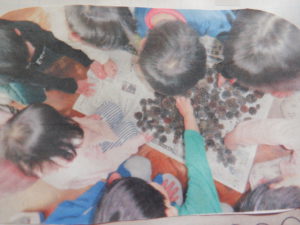 園に戻って数えてみました。たくさんでとても年少児に数えられる数ではないので、10個ずつの集めてみます。