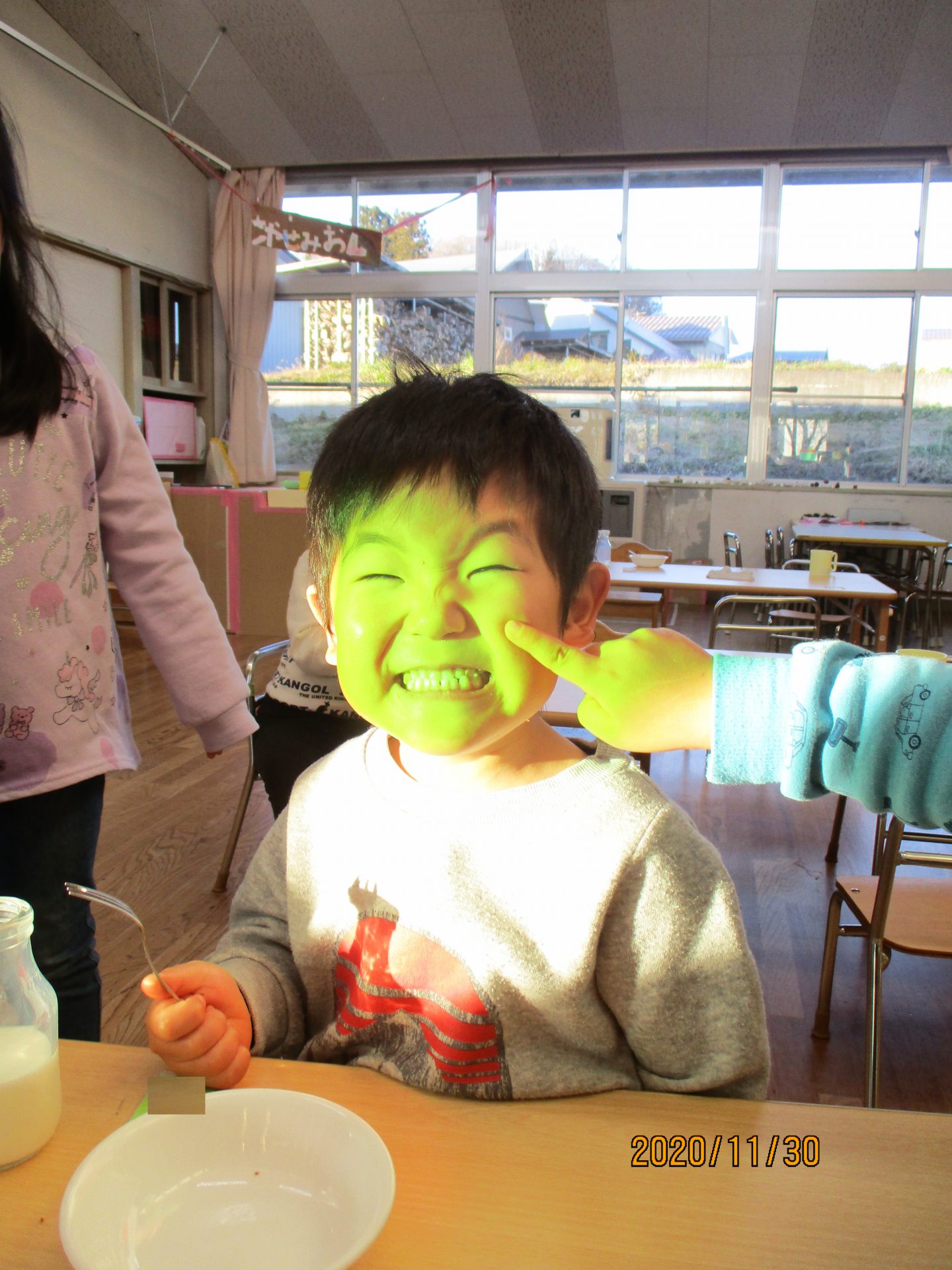 緑色になったお友だち。ぼくは何だか分からないけど、みんなにすごい!と褒められているので、「いひひ」と自慢げです笑