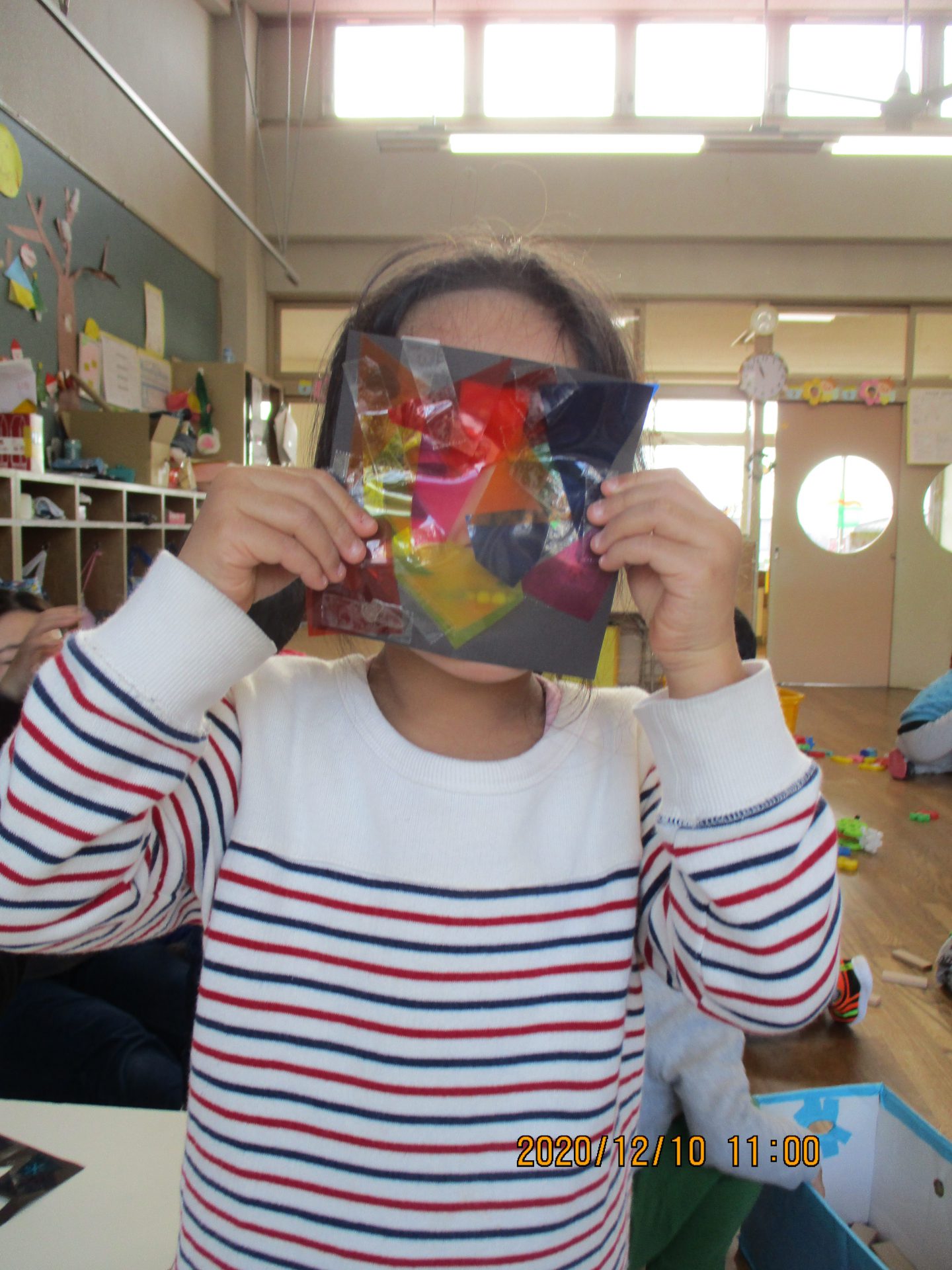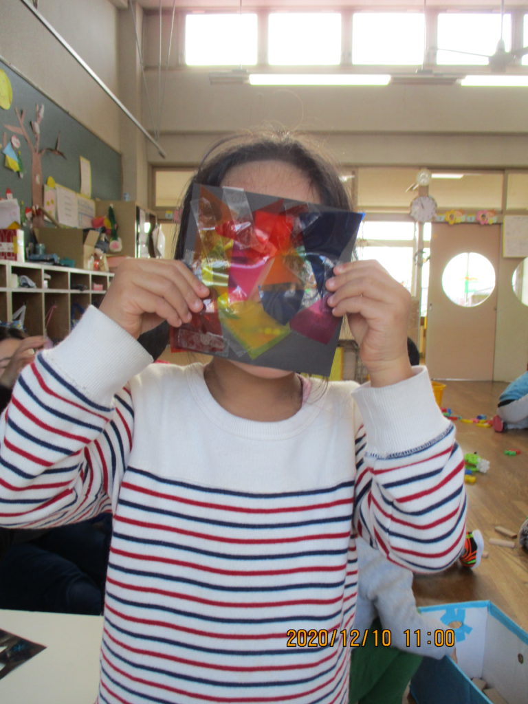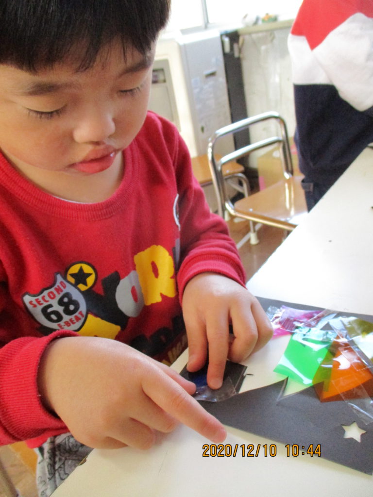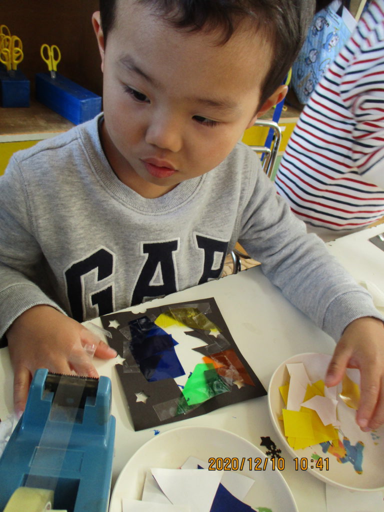 そして、子どもたちが光に興味を持つ様子もあり、クリスマス前だったのでクリスマスのステンドグラスを作ることに!