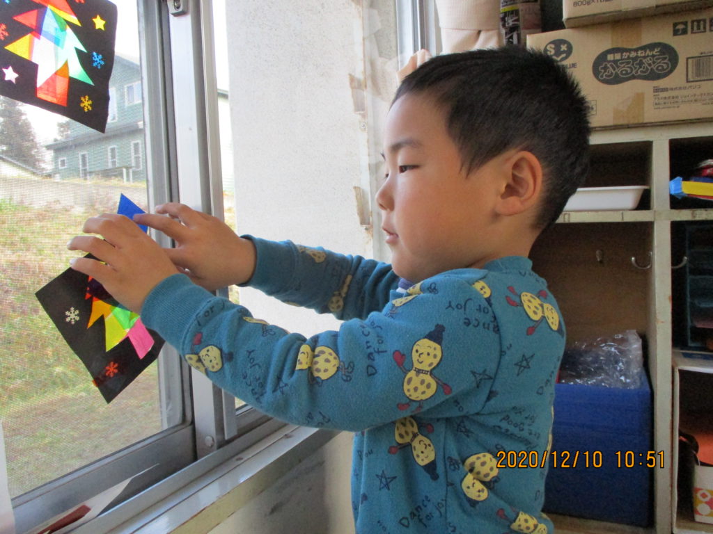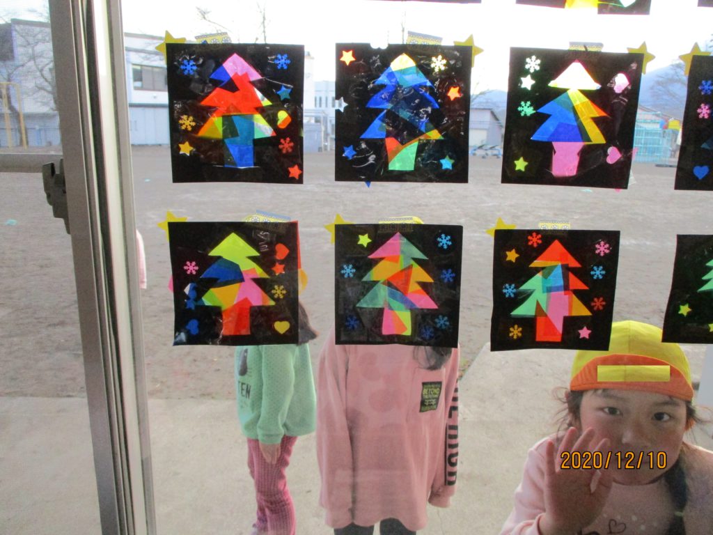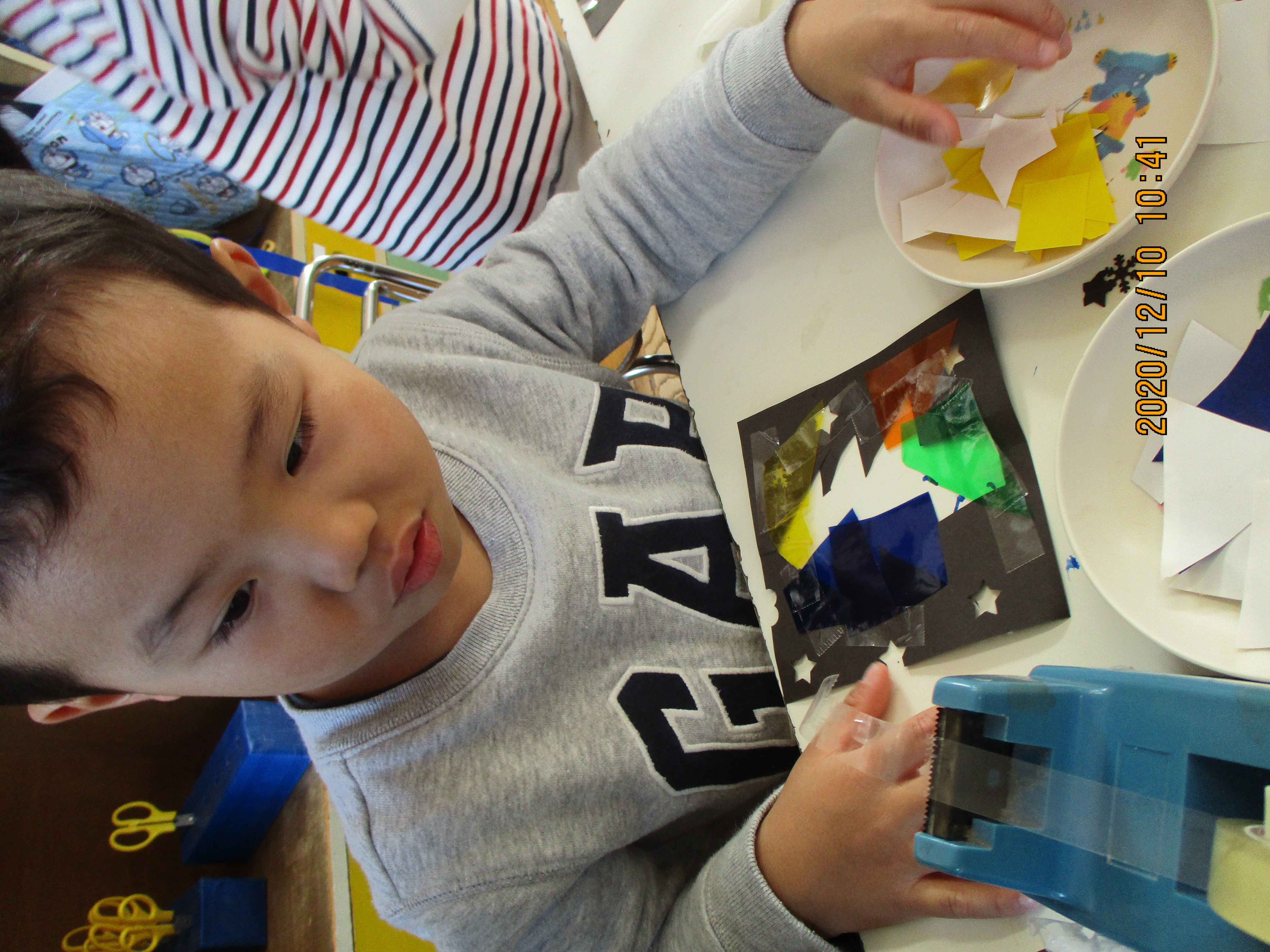 そして、子どもたちが光に興味を持つ様子もあり、クリスマス前だったのでクリスマスのステンドグラスを作ることに!