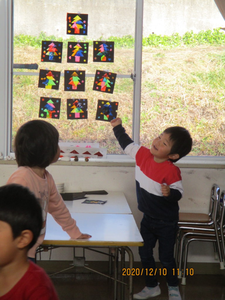 早速出来上がったものを窓に貼ると、「これぼくつくったよ!」と見せ合いっこしていました。