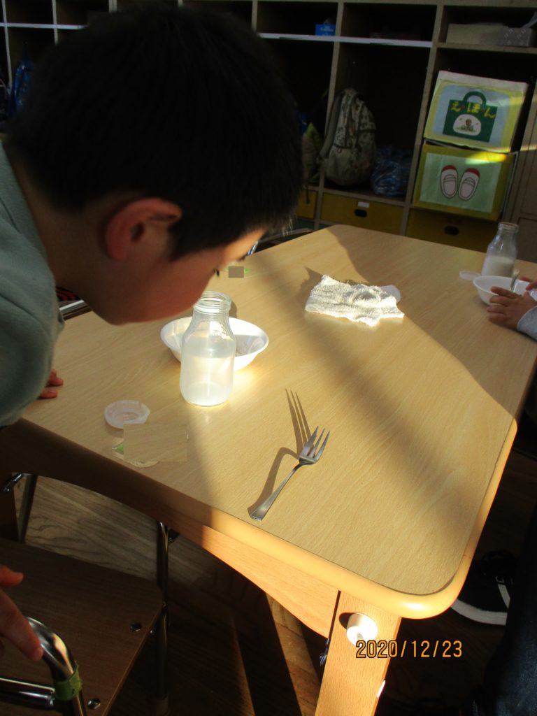 日の差す角度、太陽の位置が冬にかけて変化しましたよね。子どもたちにはまだ難しいですが、生活の中でいつもと違う”まぶしさ”に気づき、おもしろくてふしぎなことを保育士や友達と楽しむことができました。