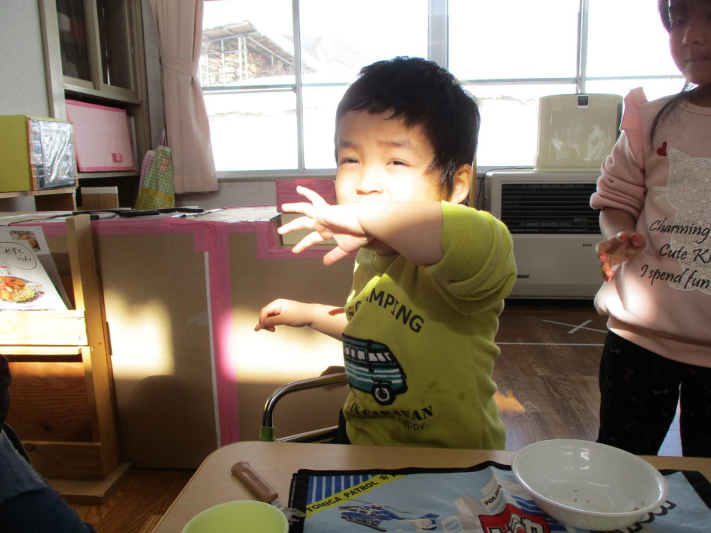 給食中に何だか「まぶしい」「なんかめがいたい」と光を遮ろうとしているお友だちです。