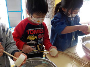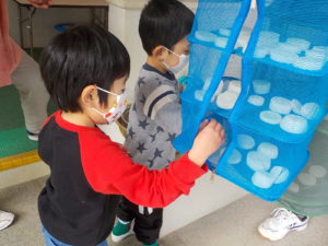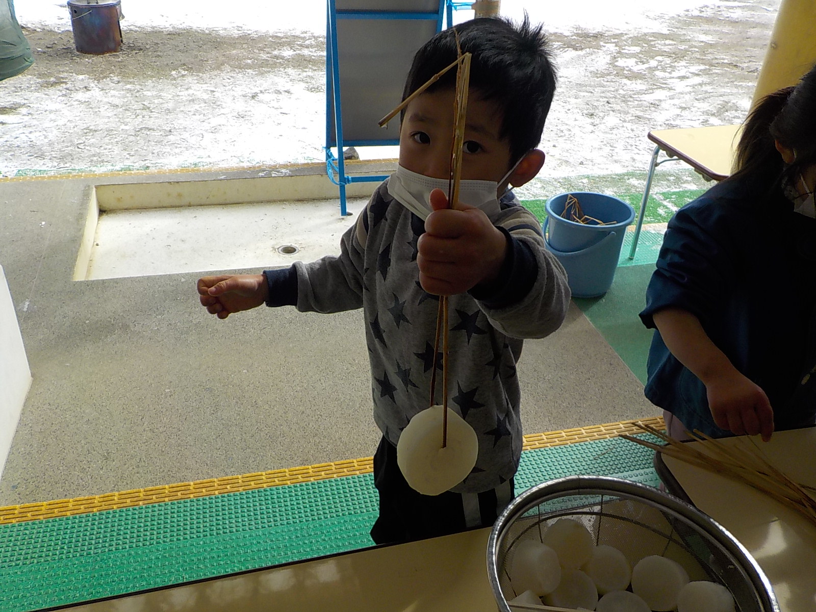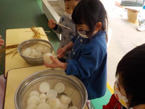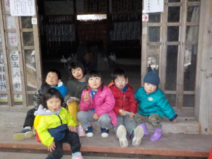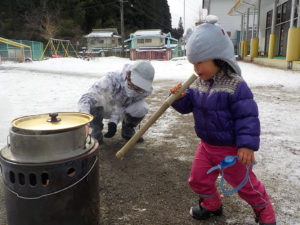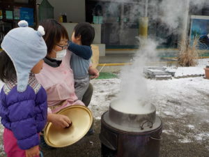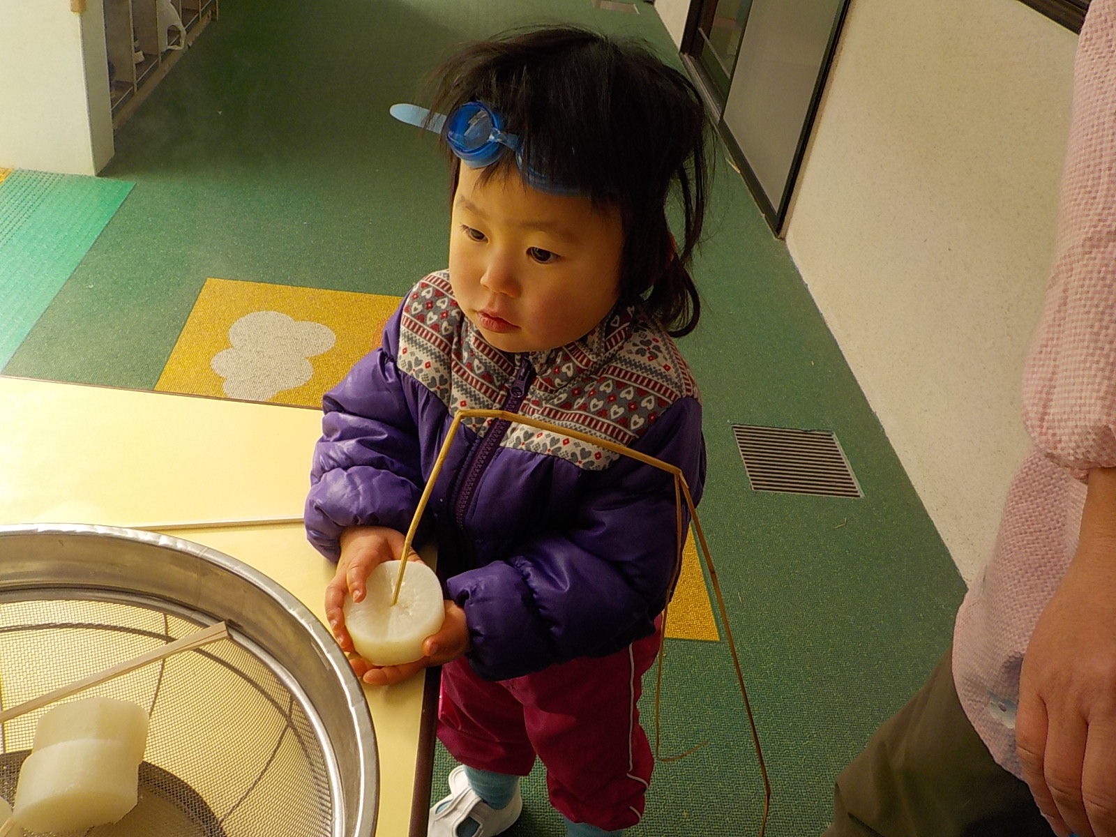 昨年は暖冬で上村のような標高が高いところでもカビが生えてしまい、ほとんど食べられませんでした。この日は最高気温が園庭の温度計でマイナス1.5度でした。干した大根はすぐに凍り始め午後にはカチカチに。これから大根が形や色を変えていくところをみんなで観察して行きたいと思います。出来上がったものは給食で煮物につかいます。干すことで鉄分が普通の大根の16倍、ビタミンB1、ビタミンB2が30倍、カリウムは15倍、カルシウムは22倍になるそうです。保存食としてもいいし、栄養価も高いし、先人たちの知恵をしっかり子どもたちが受け継いで、残していけたらと思います。