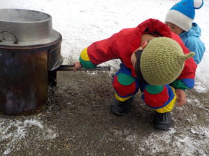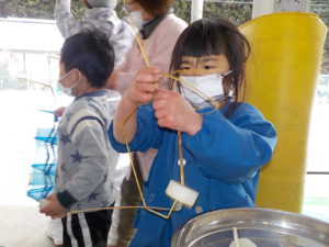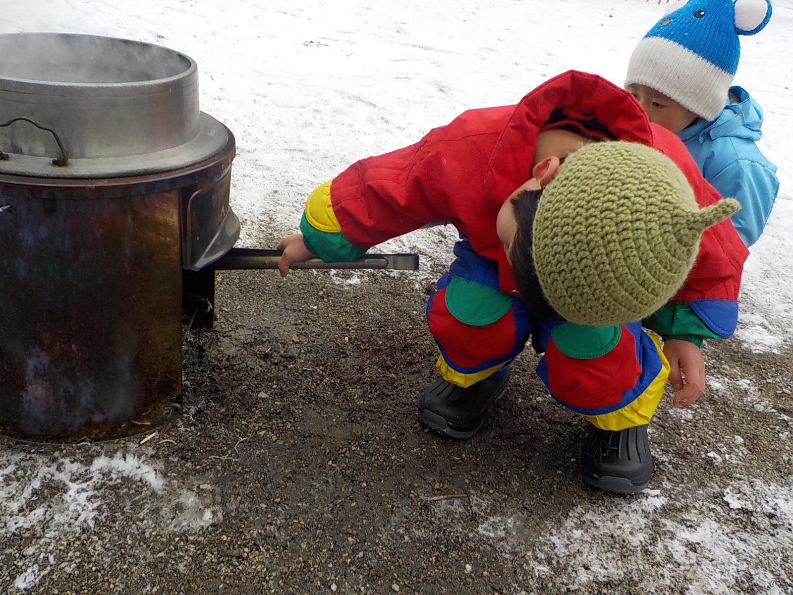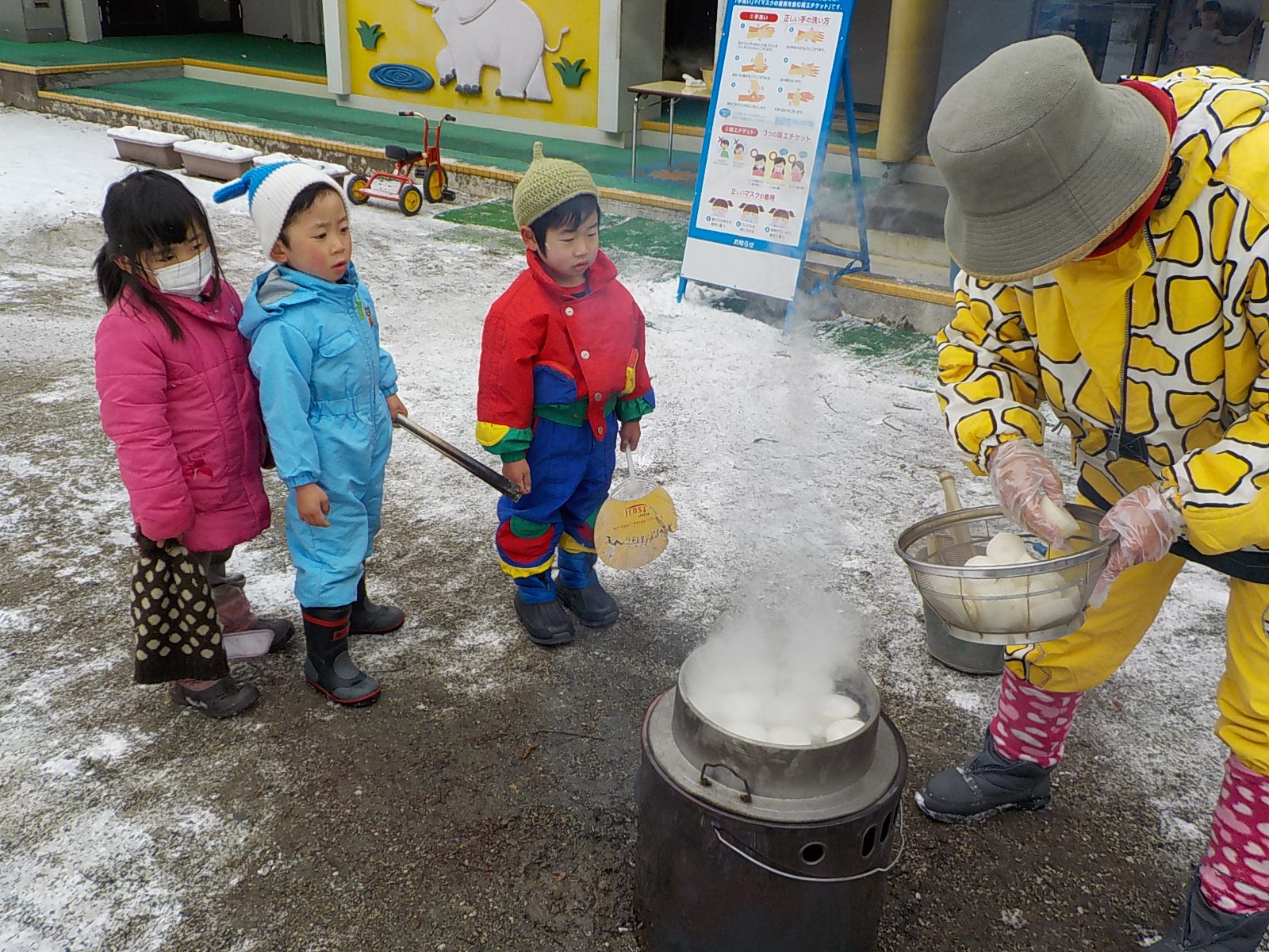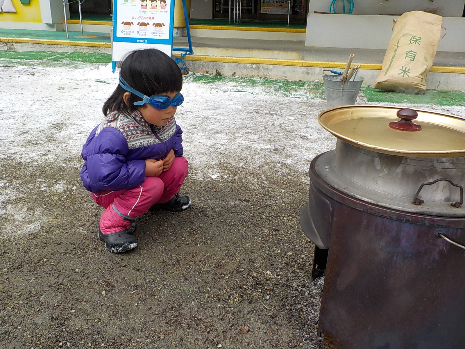 昨年は暖冬で上村のような標高が高いところでもカビが生えてしまい、ほとんど食べられませんでした。この日は最高気温が園庭の温度計でマイナス1.5度でした。干した大根はすぐに凍り始め午後にはカチカチに。これから大根が形や色を変えていくところをみんなで観察して行きたいと思います。出来上がったものは給食で煮物につかいます。干すことで鉄分が普通の大根の16倍、ビタミンB1、ビタミンB2が30倍、カリウムは15倍、カルシウムは22倍になるそうです。保存食としてもいいし、栄養価も高いし、先人たちの知恵をしっかり子どもたちが受け継いで、残していけたらと思います。