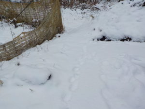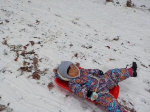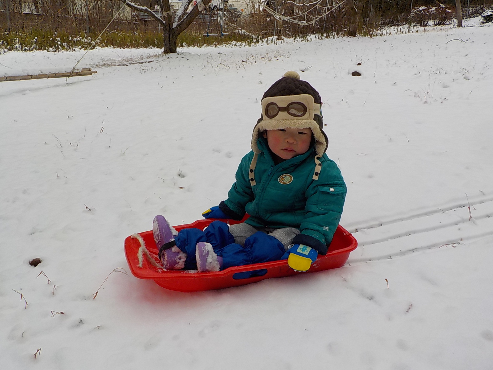 今年一番の寒さでしたが昨夜からの雪で裏山にもうっすら積りました。ソリ遊びができるぞ、と意気揚々と出発。
