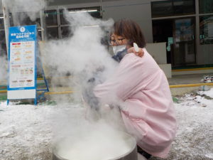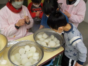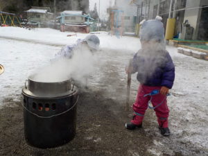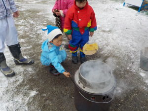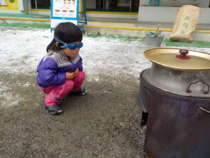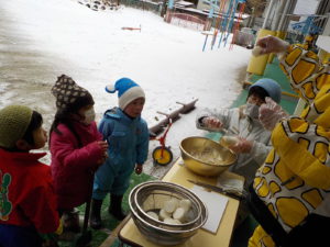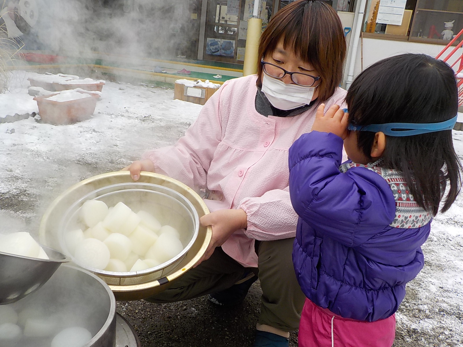 園で収穫した大根を先生たちが洗って皮を向いて切ります。寒くてみんなスキーウエアです。