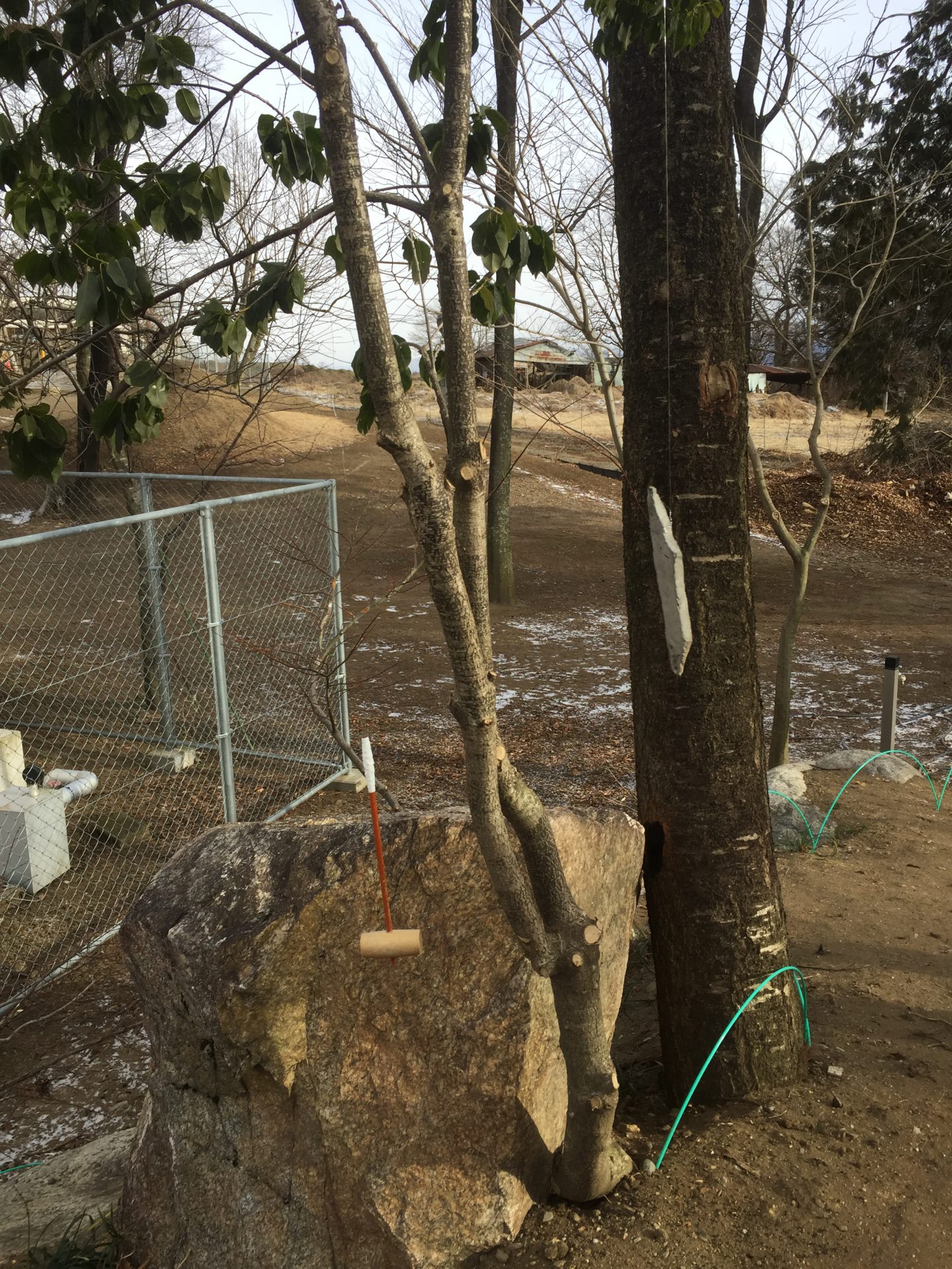 完成した小道には誰でも「サヌカイト」がたたけるよう吊るしてありました。