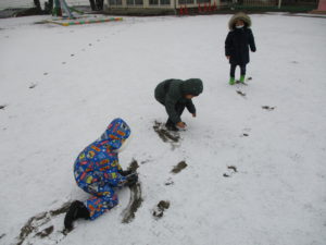 雪が降り始めると、気になって「外に行ってもいい?」と声を掛けてくる子が何人もいました。午後にようやく遊べるくらいの雪になり、子どもたちは勢いよく飛びだしていきました。それぞれいろいろな遊びで雪に触れ、楽しんでいました。これからもまだ雪が降ることがあると思いますので、雪遊びもたくさん楽しんでほしいです。