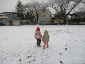 先日は、子どもたちが楽しみにしていた雪が降りました!午前中はなかなか積もらず、窓から外を眺めていましたが、午後にはようやくうっすらと積もりました!!