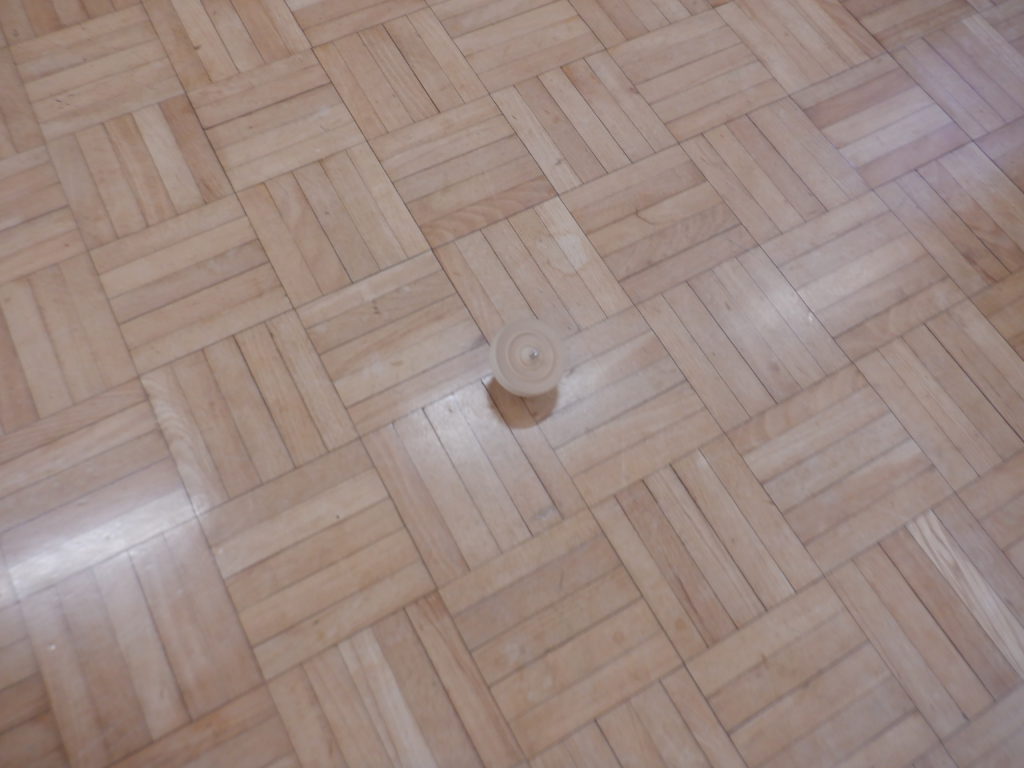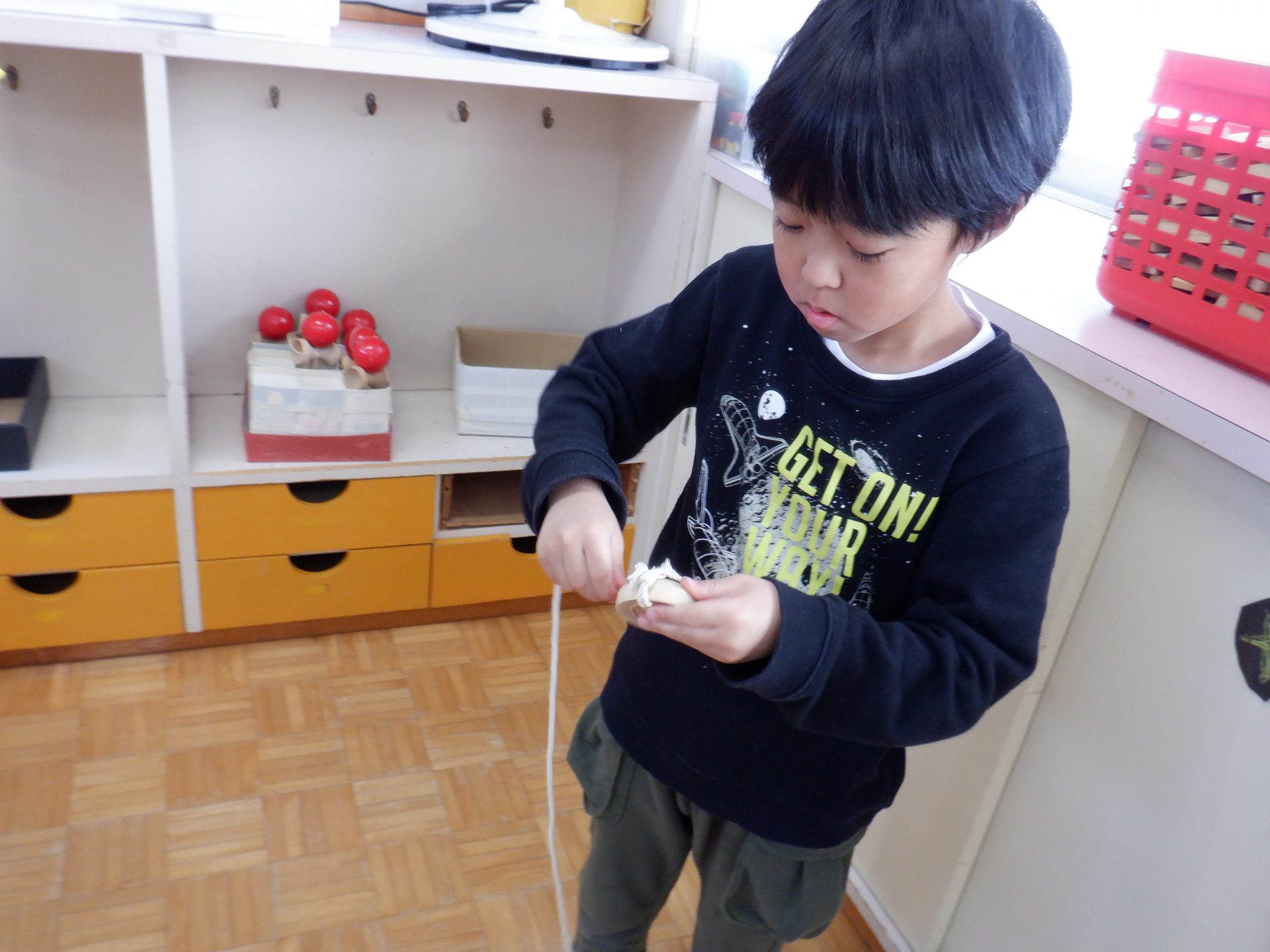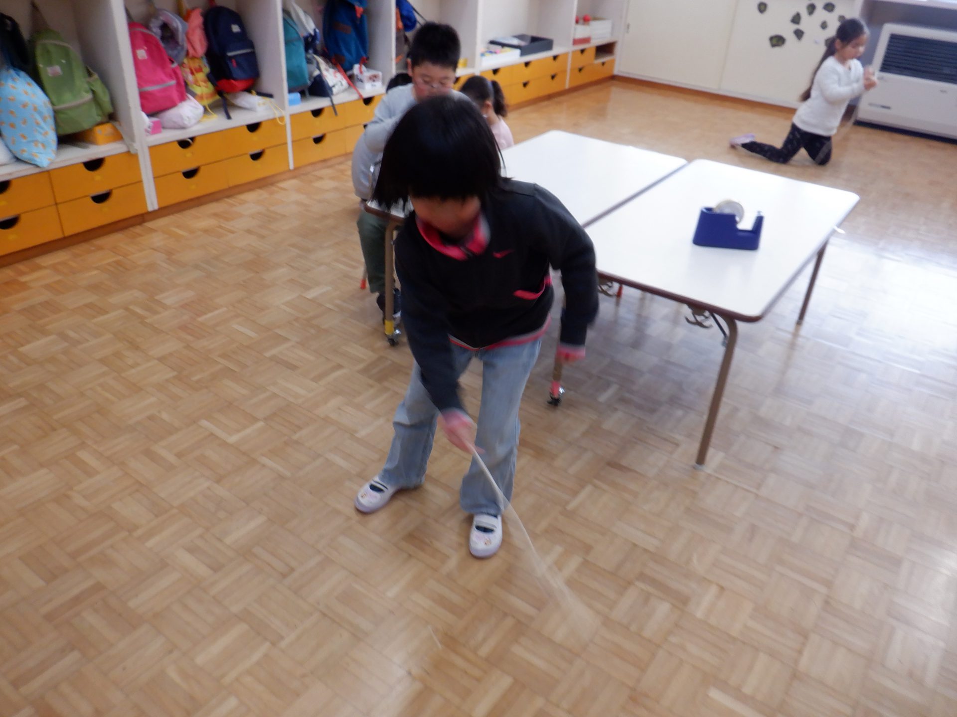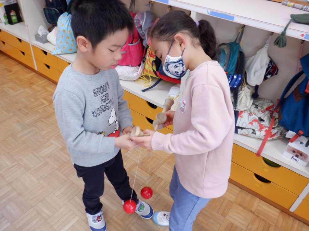 年長さんはひもを巻いて回す昔ながらの独楽に挑戦!