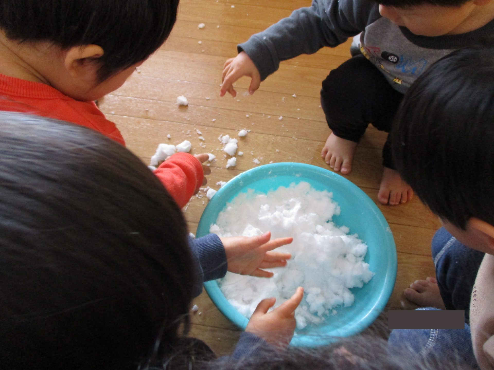 興味津々に触れてみる子、怖くてお部屋の隅に逃げる子。雪に対する子どもたちの反応は様々です。